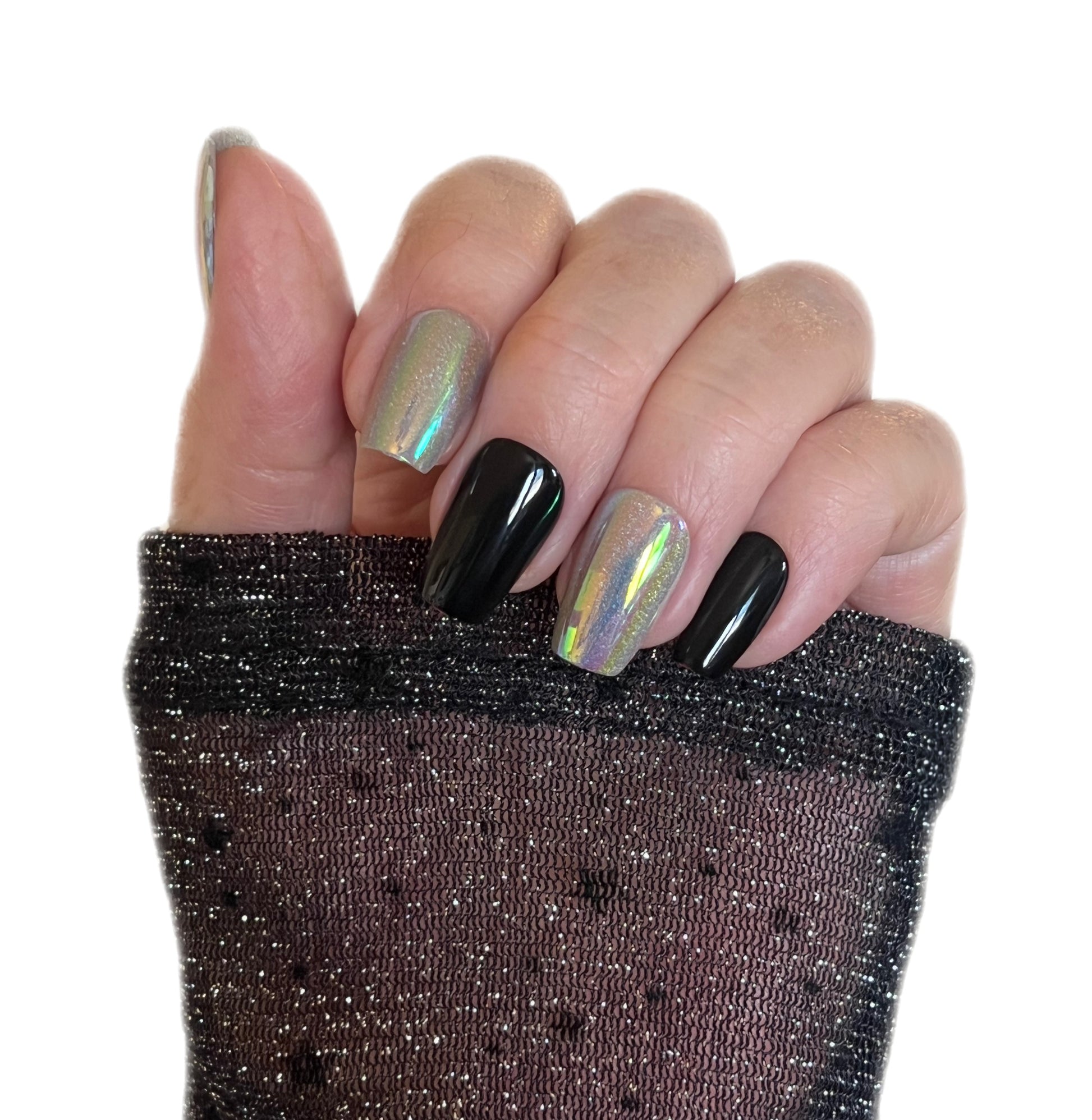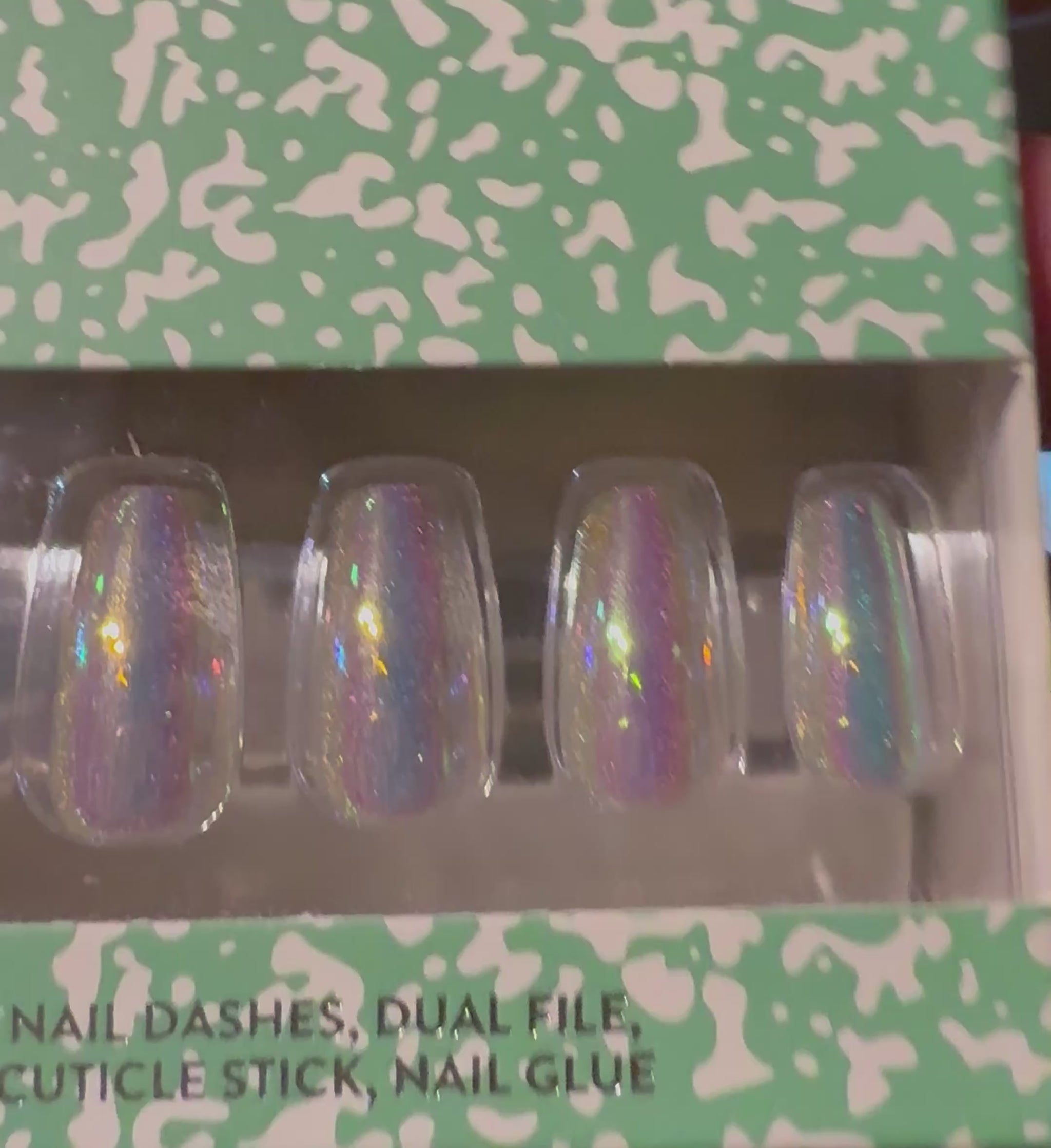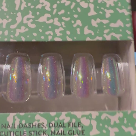 medium coffin press-on nails come in a silvery green shiny finish with a glazed nail design!