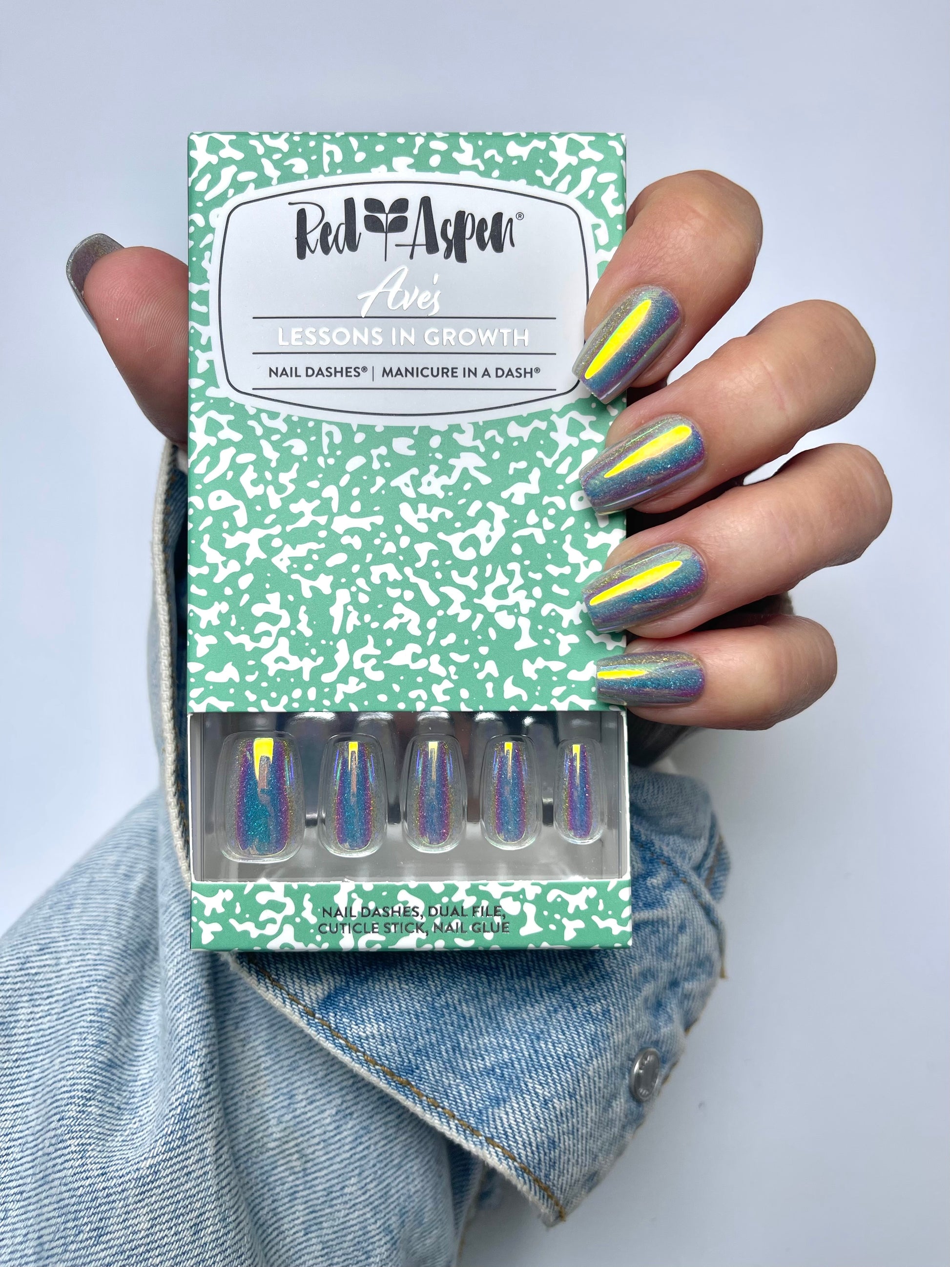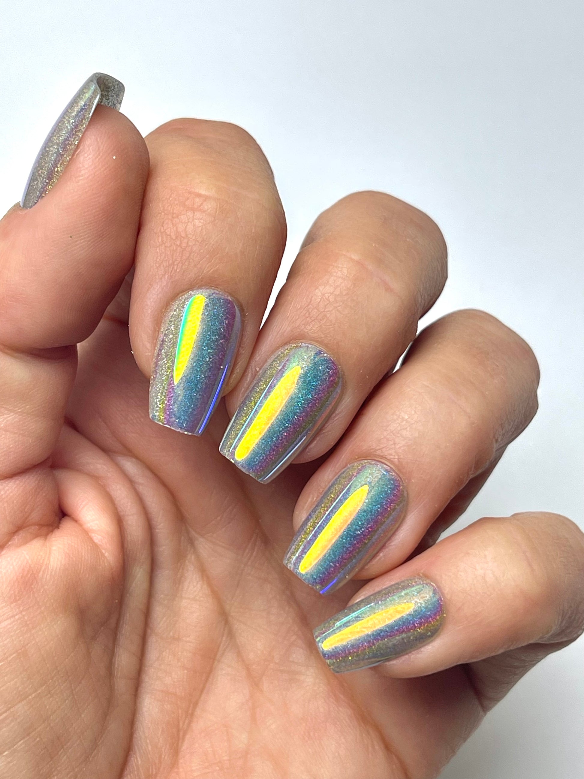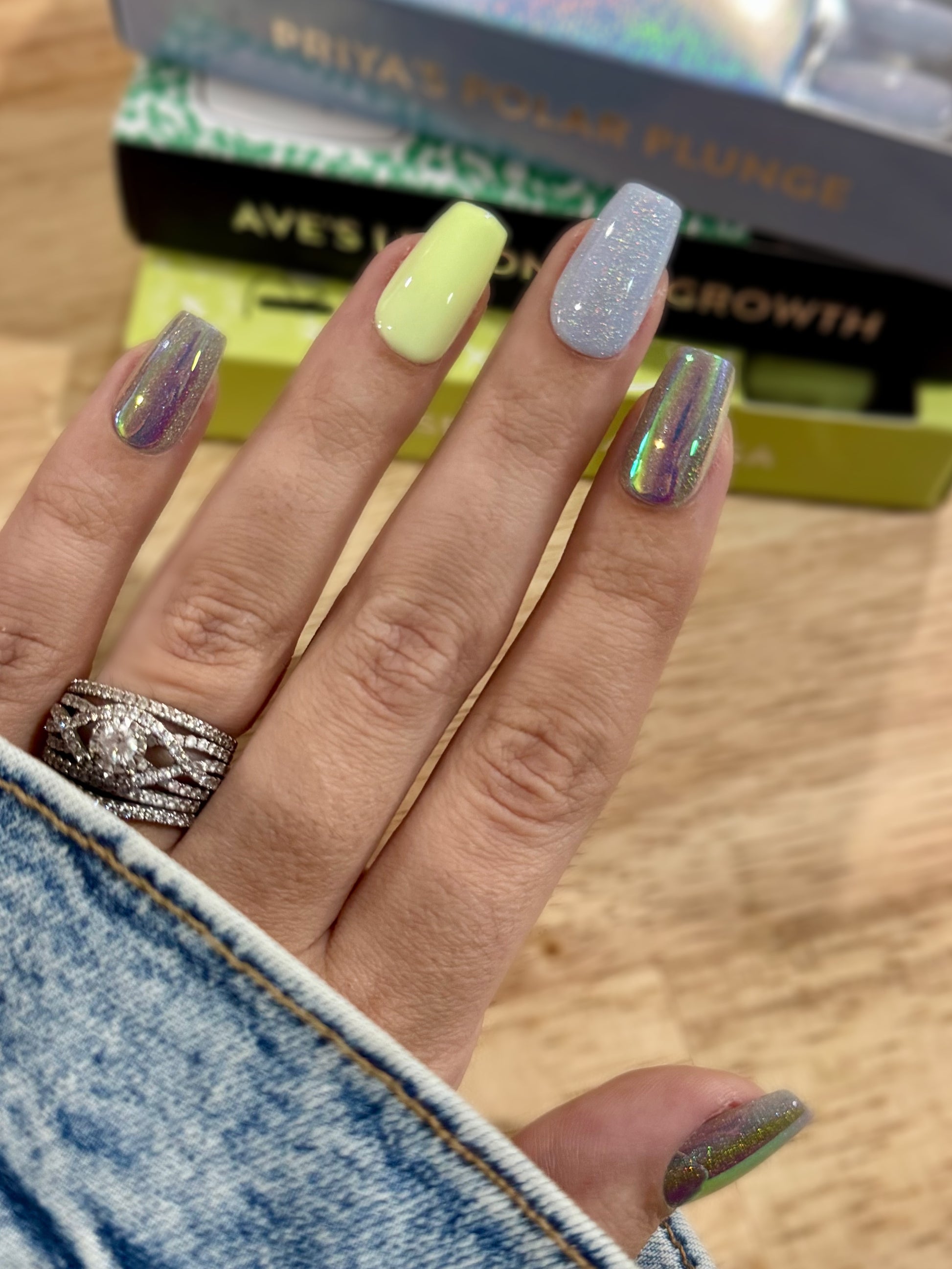 medium coffin press-on nails come in a silvery green shiny finish with a glazed nail design!