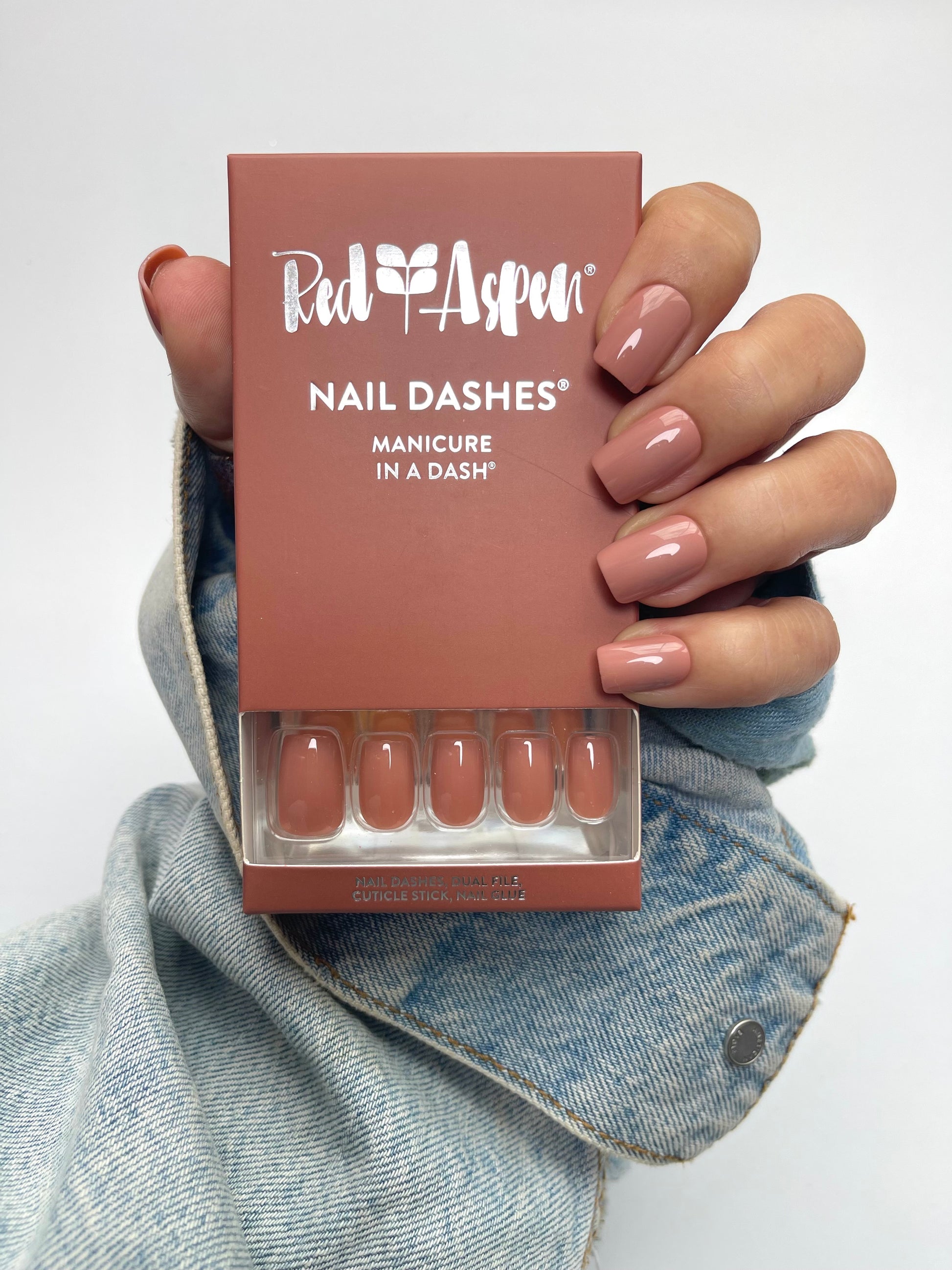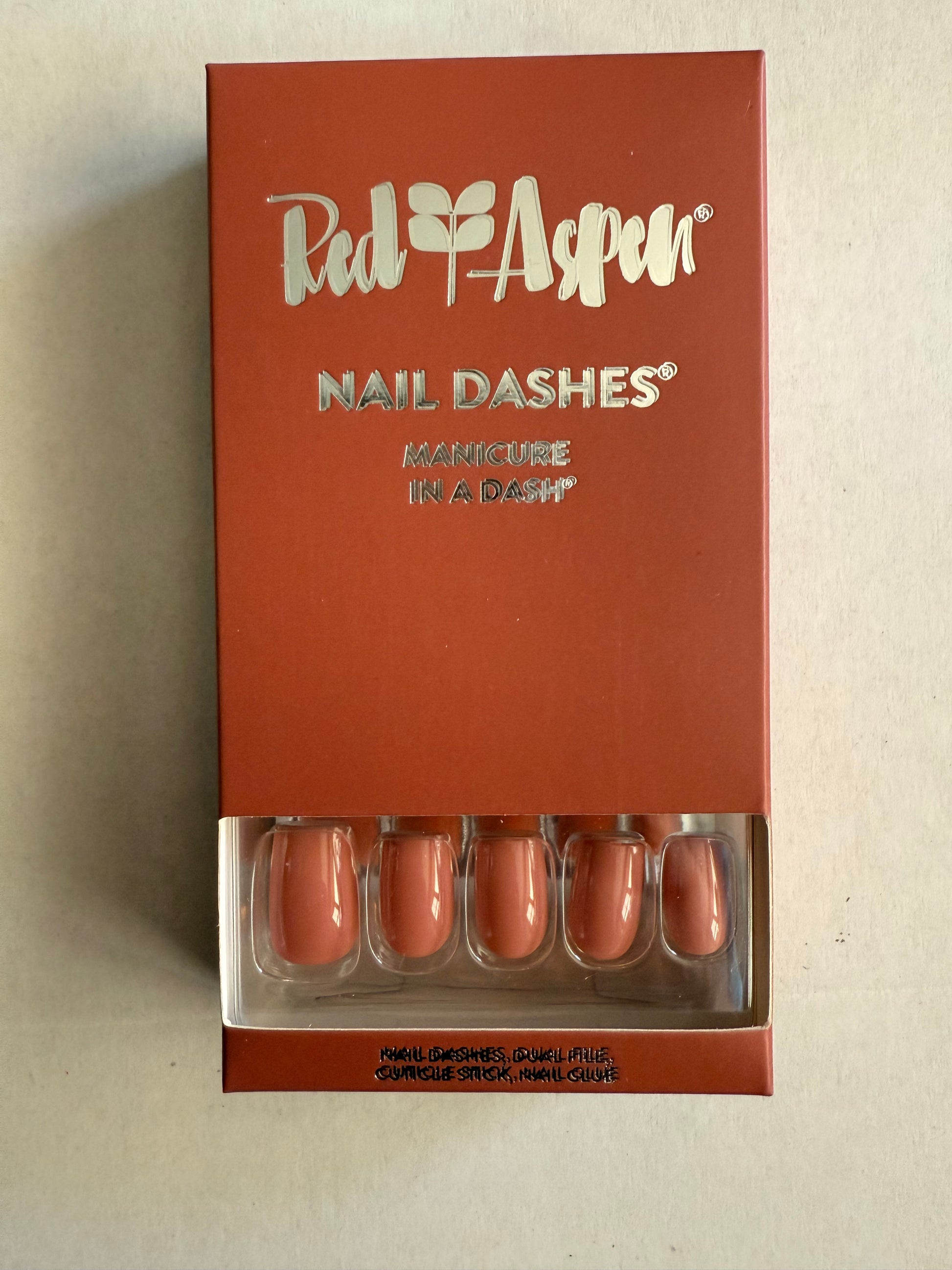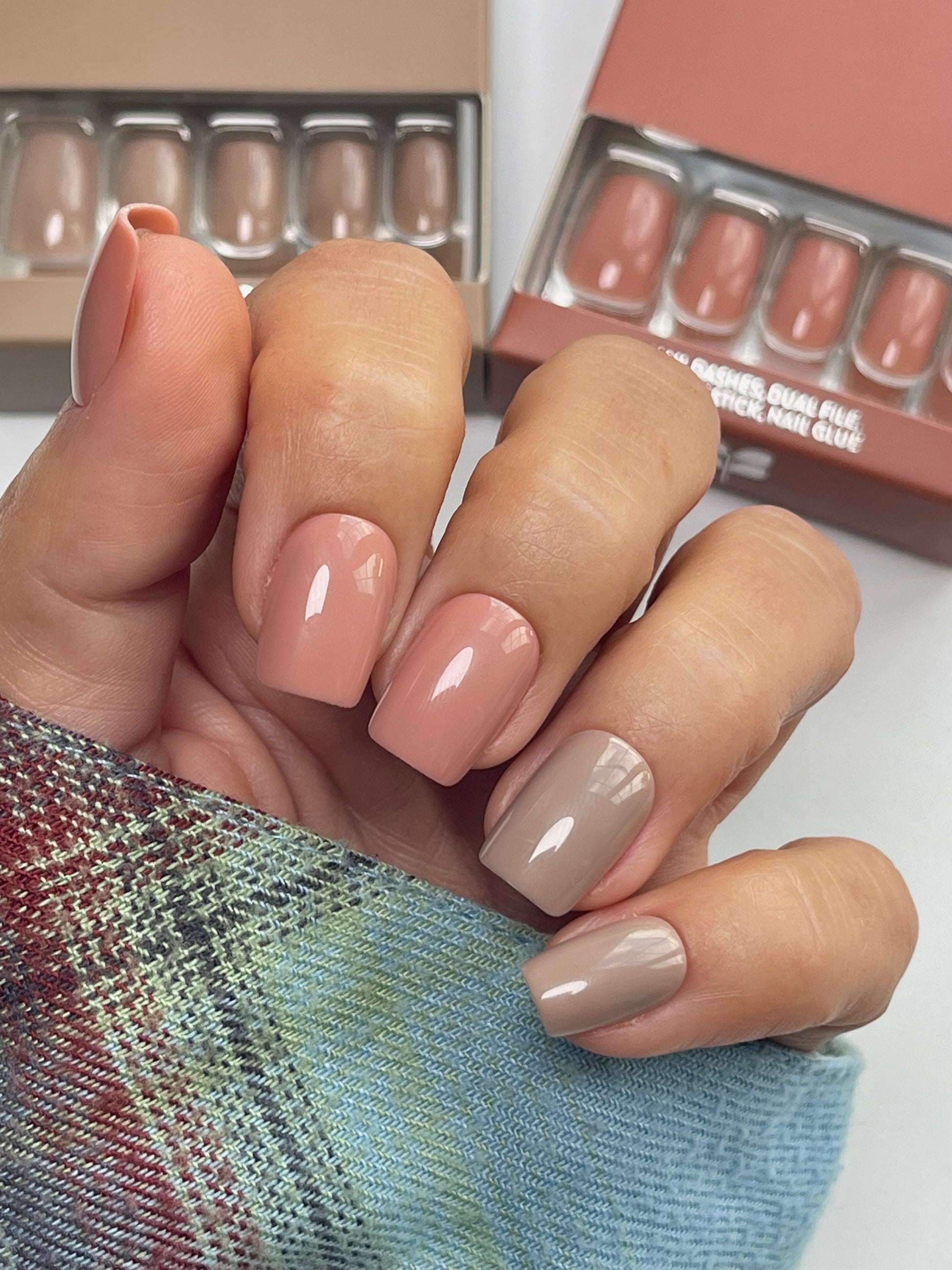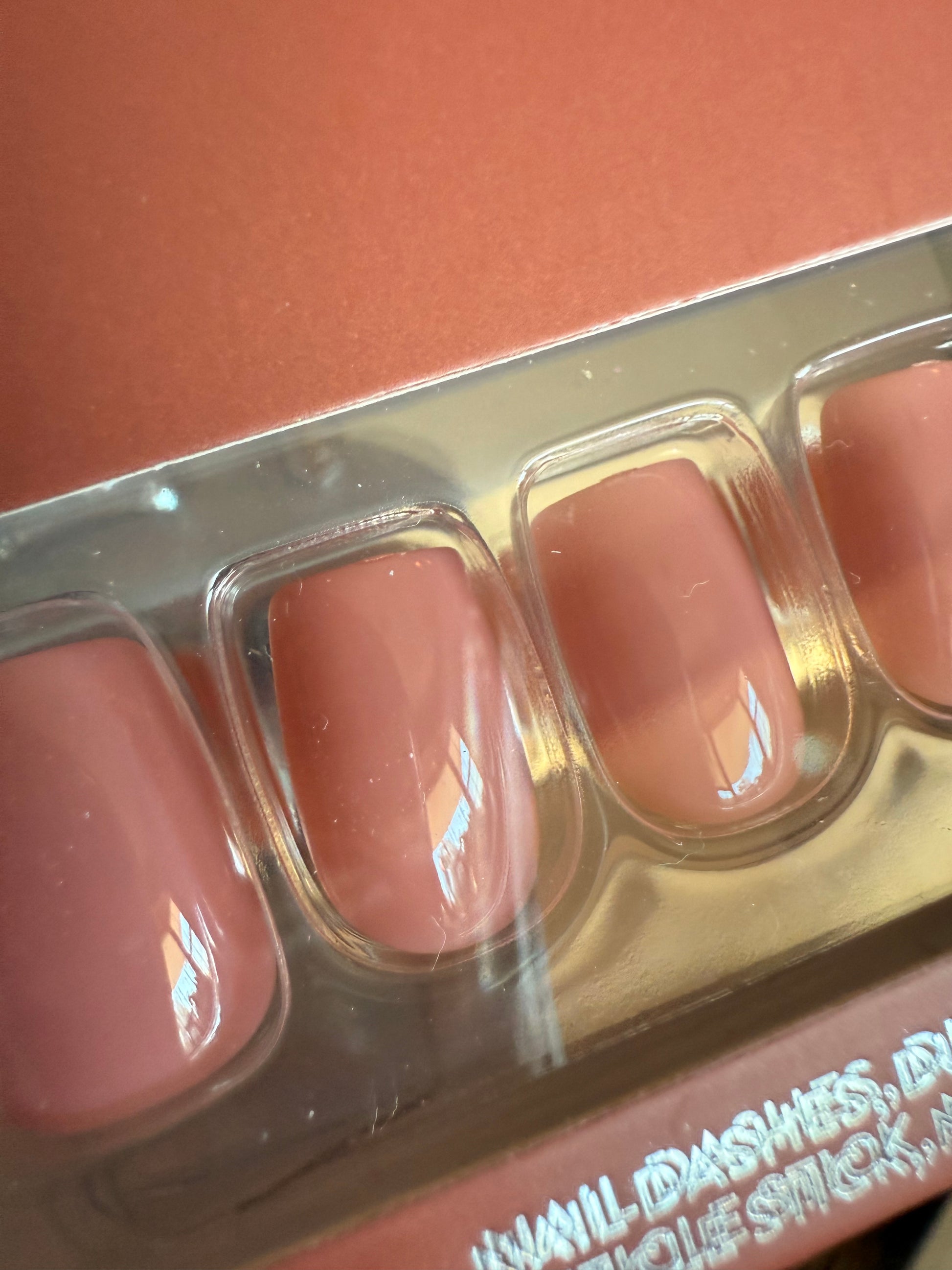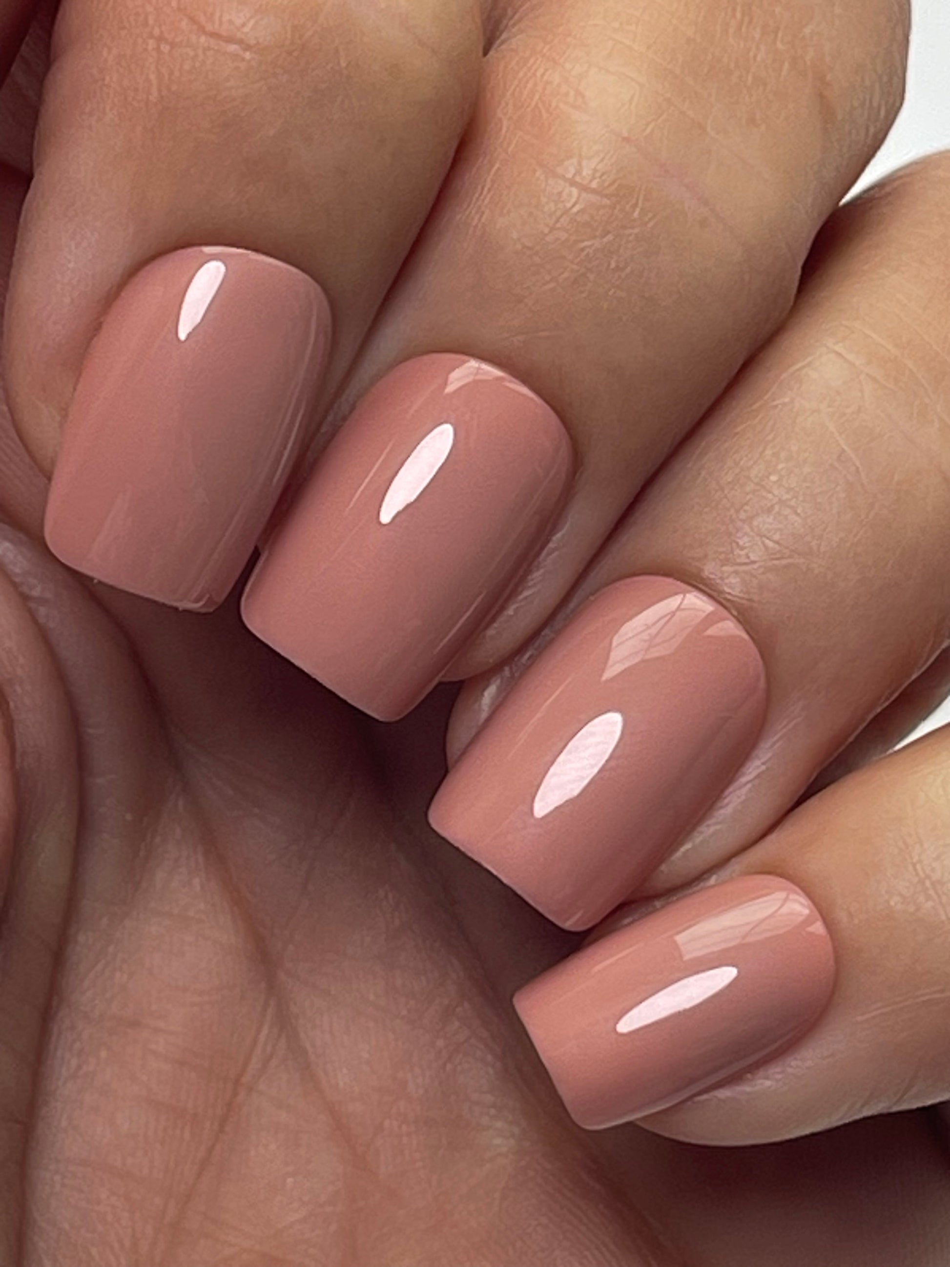 short coffin press on nails come in a brown shiny finish with a solid nail design