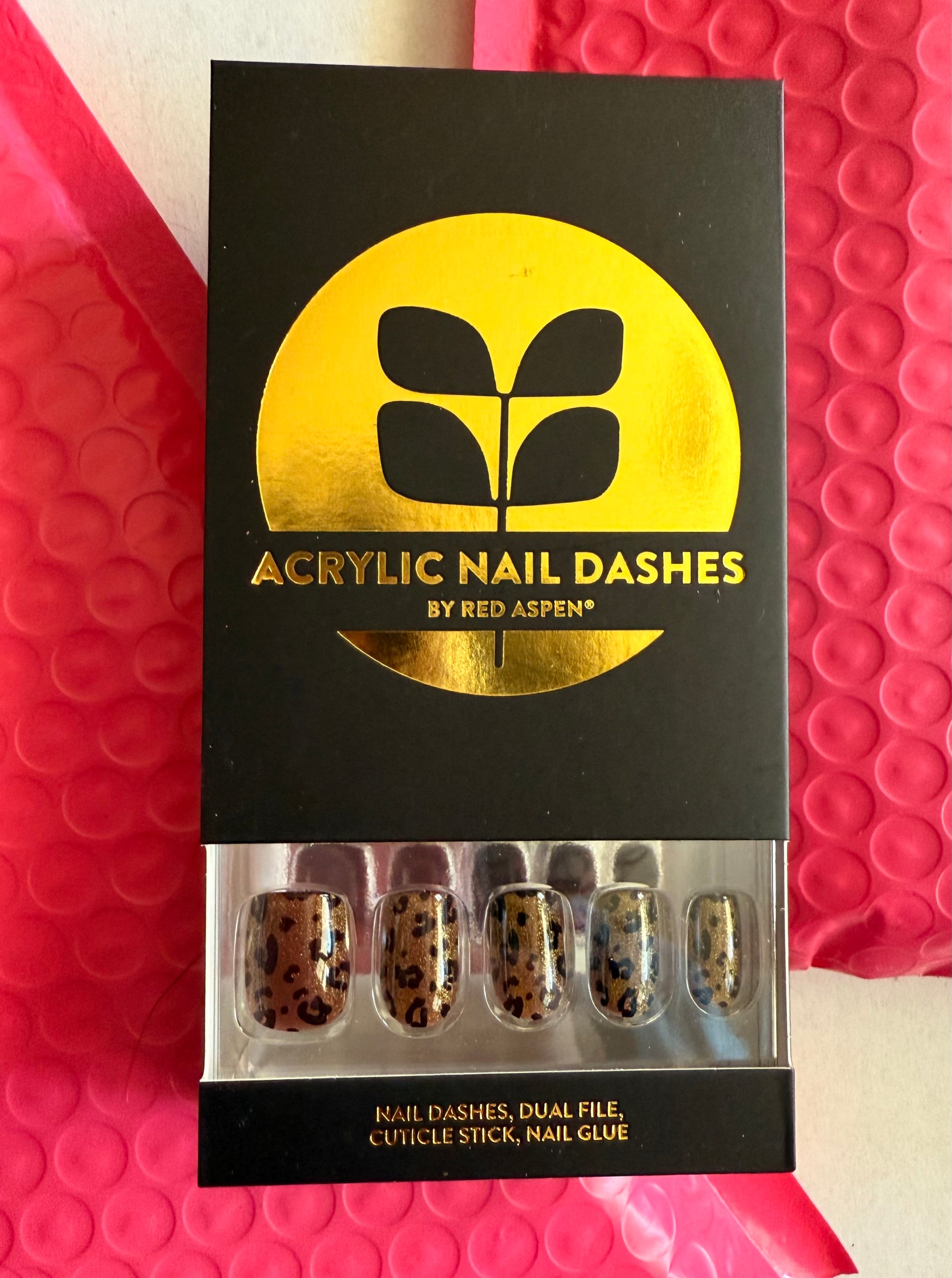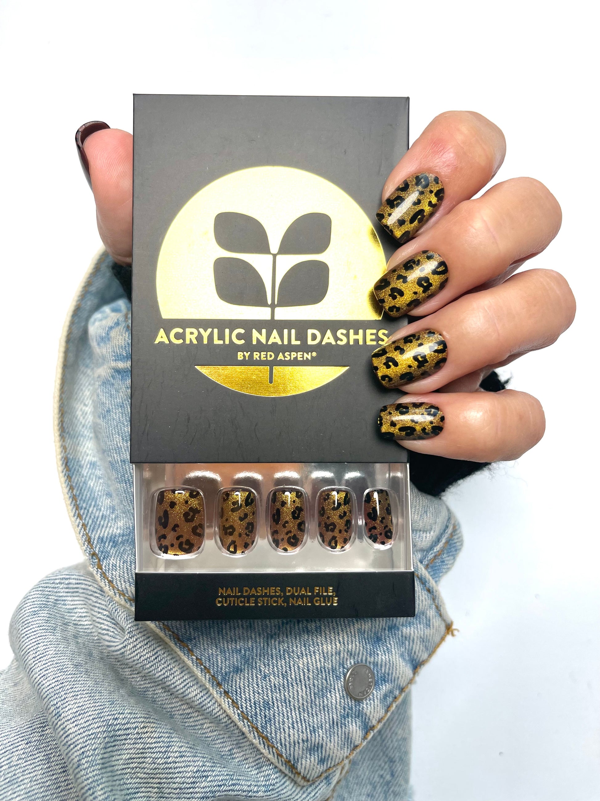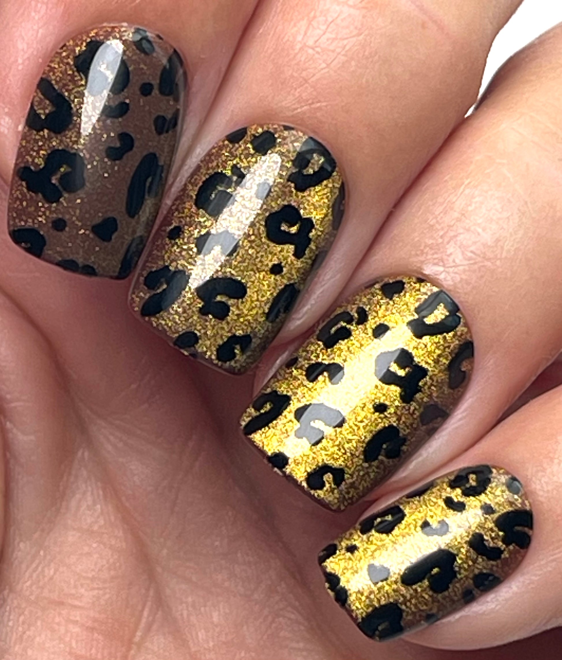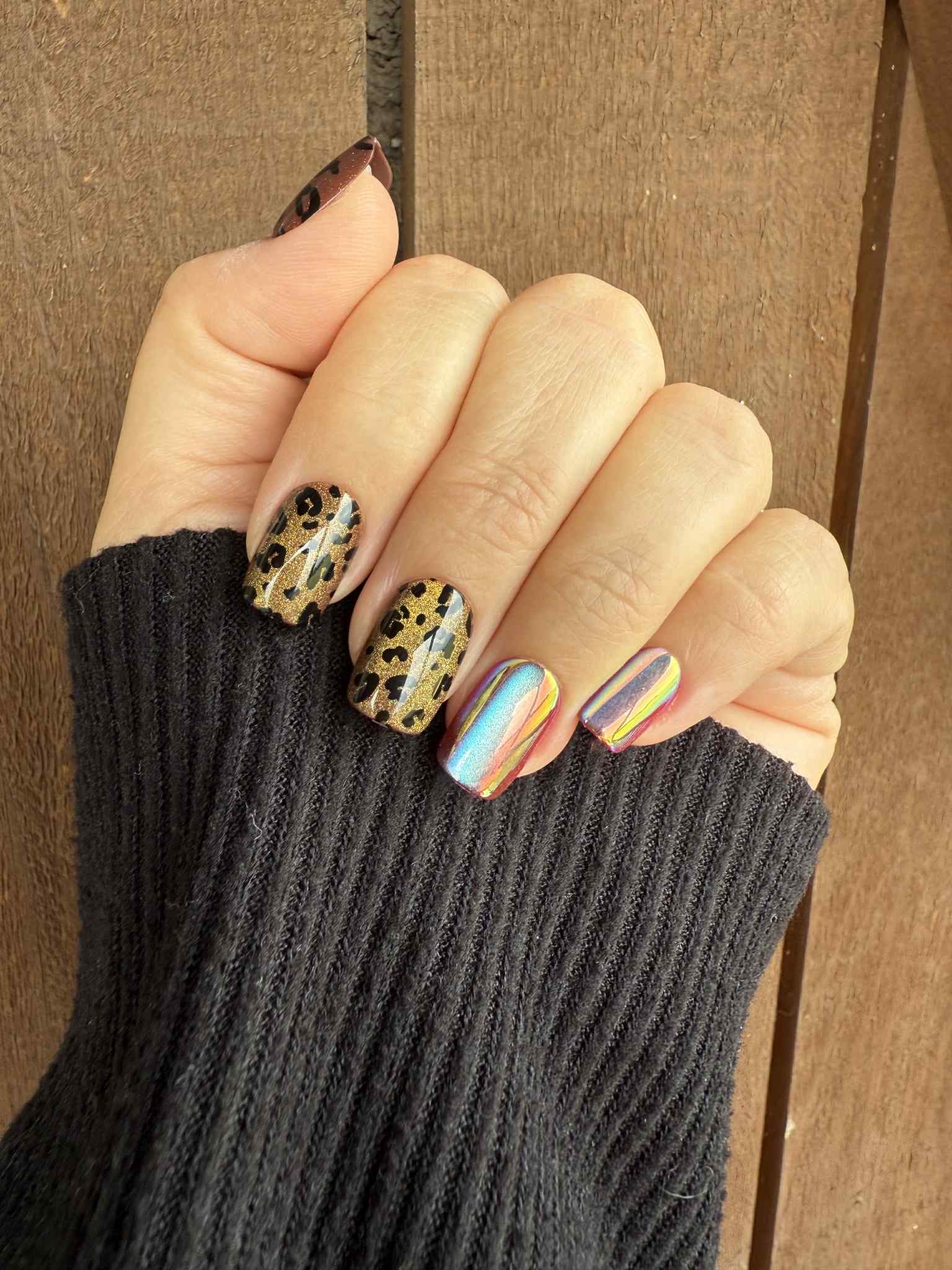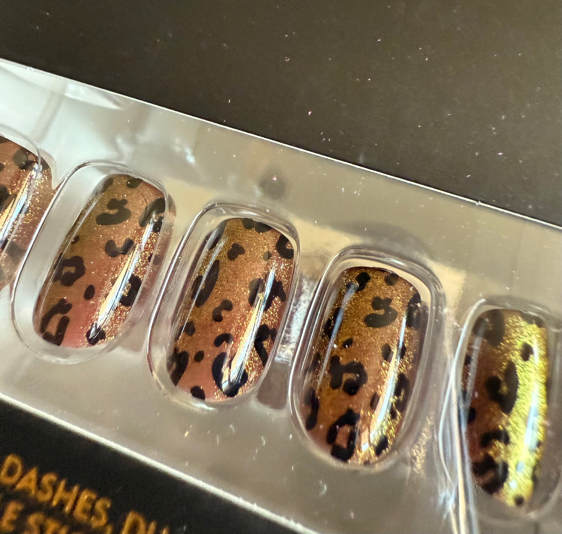 short squoval press on nails come in a black and brown shiny finish with an acrylic, cat eye, and leopard print nail design
