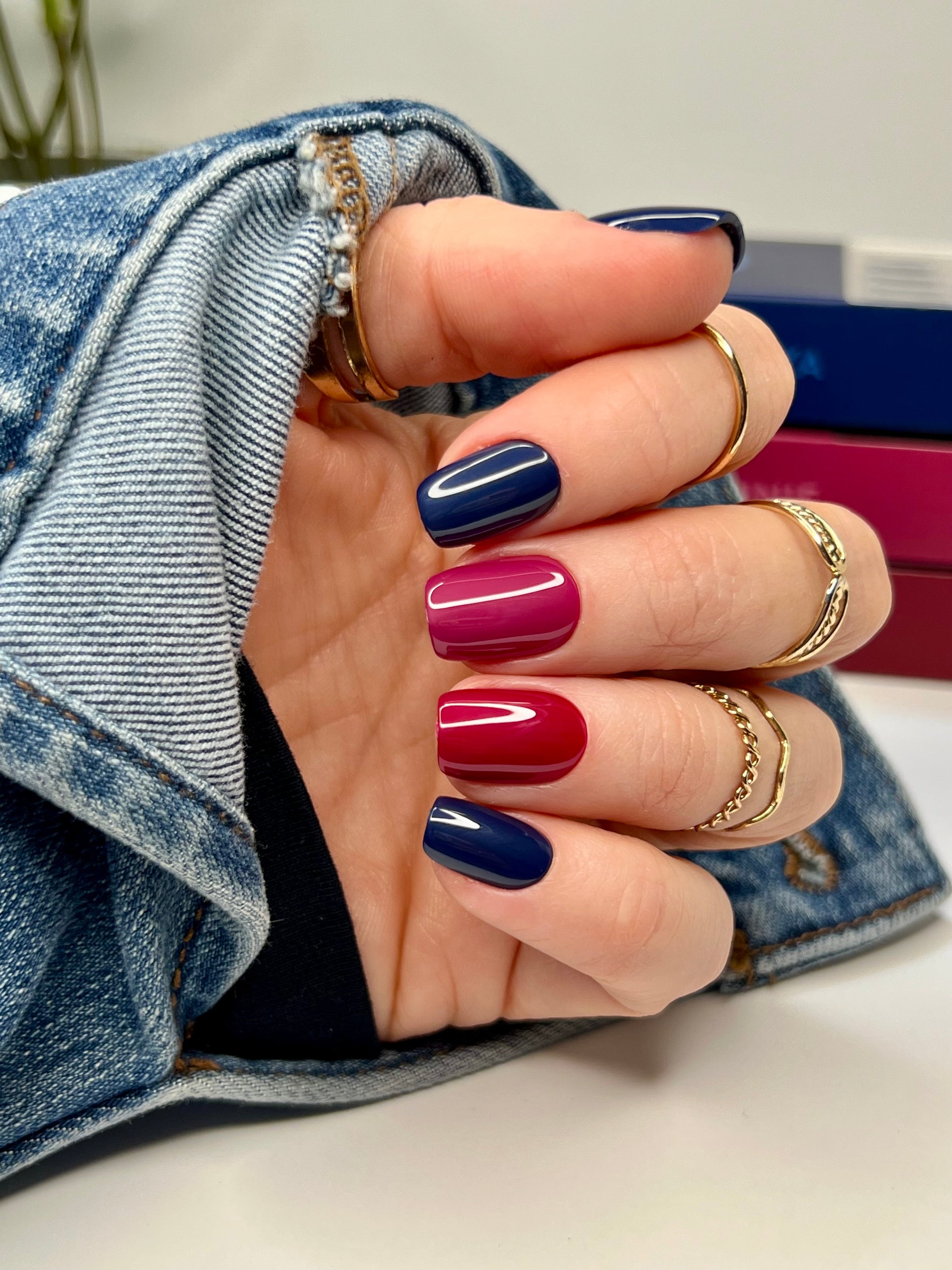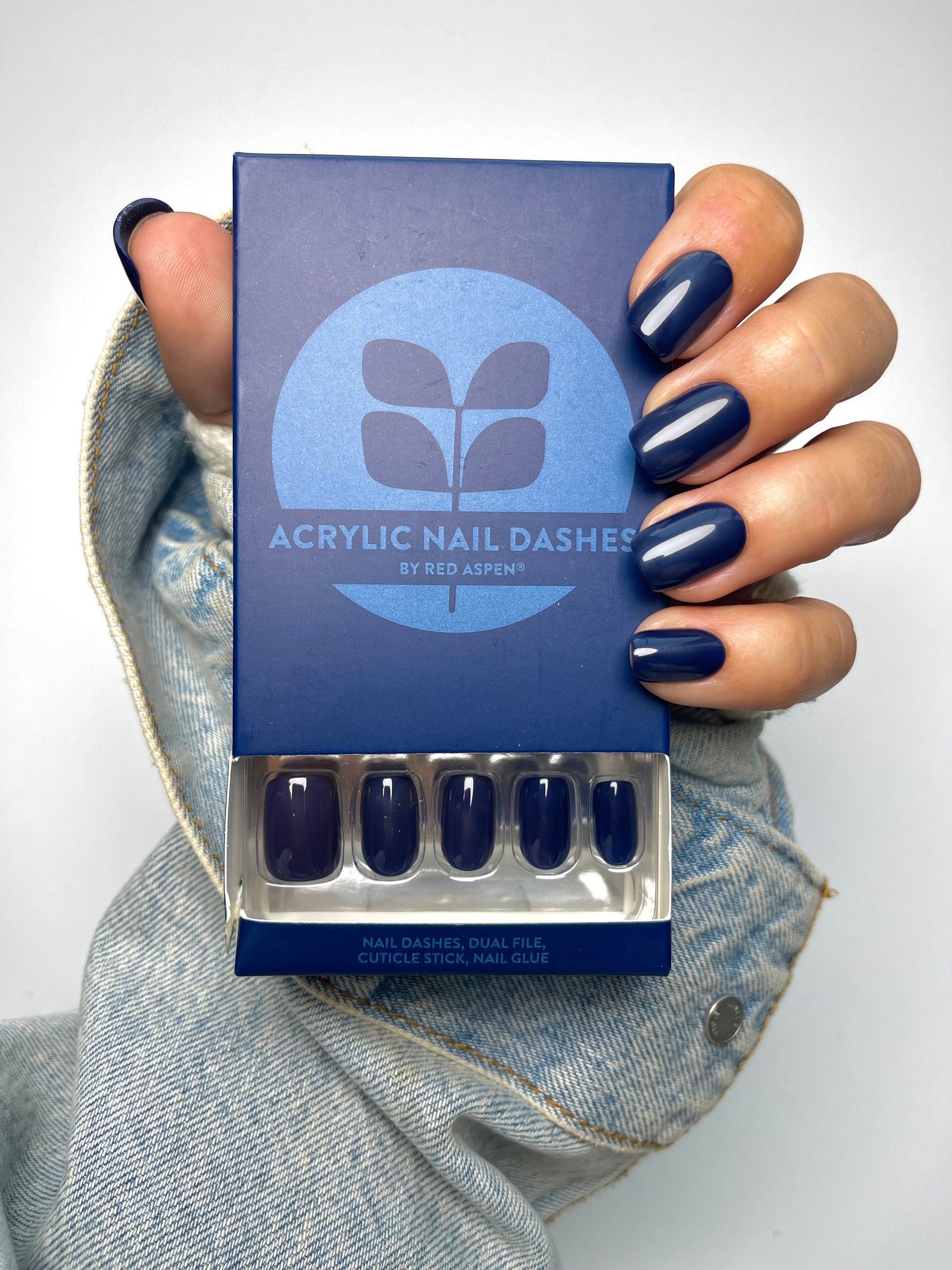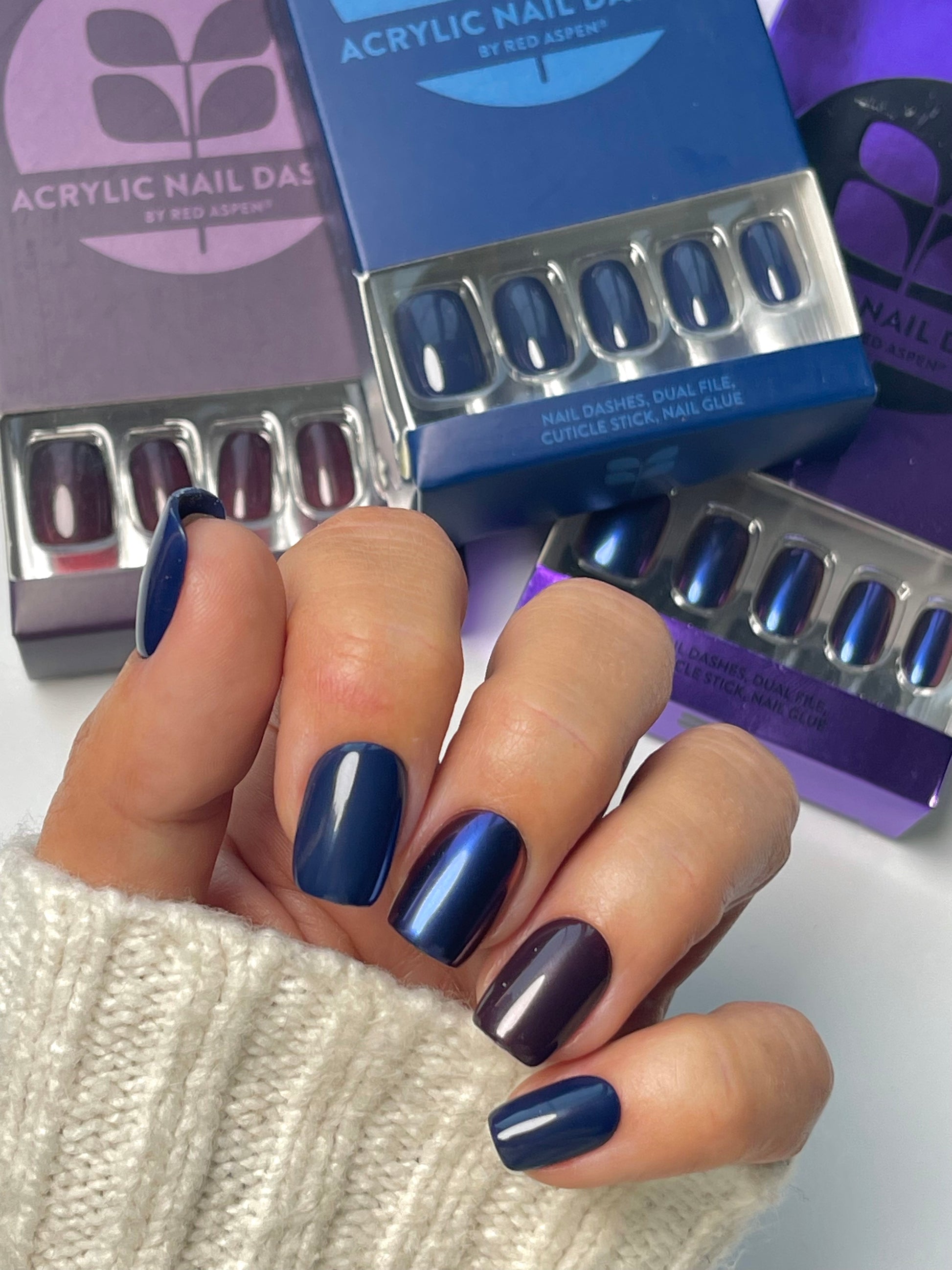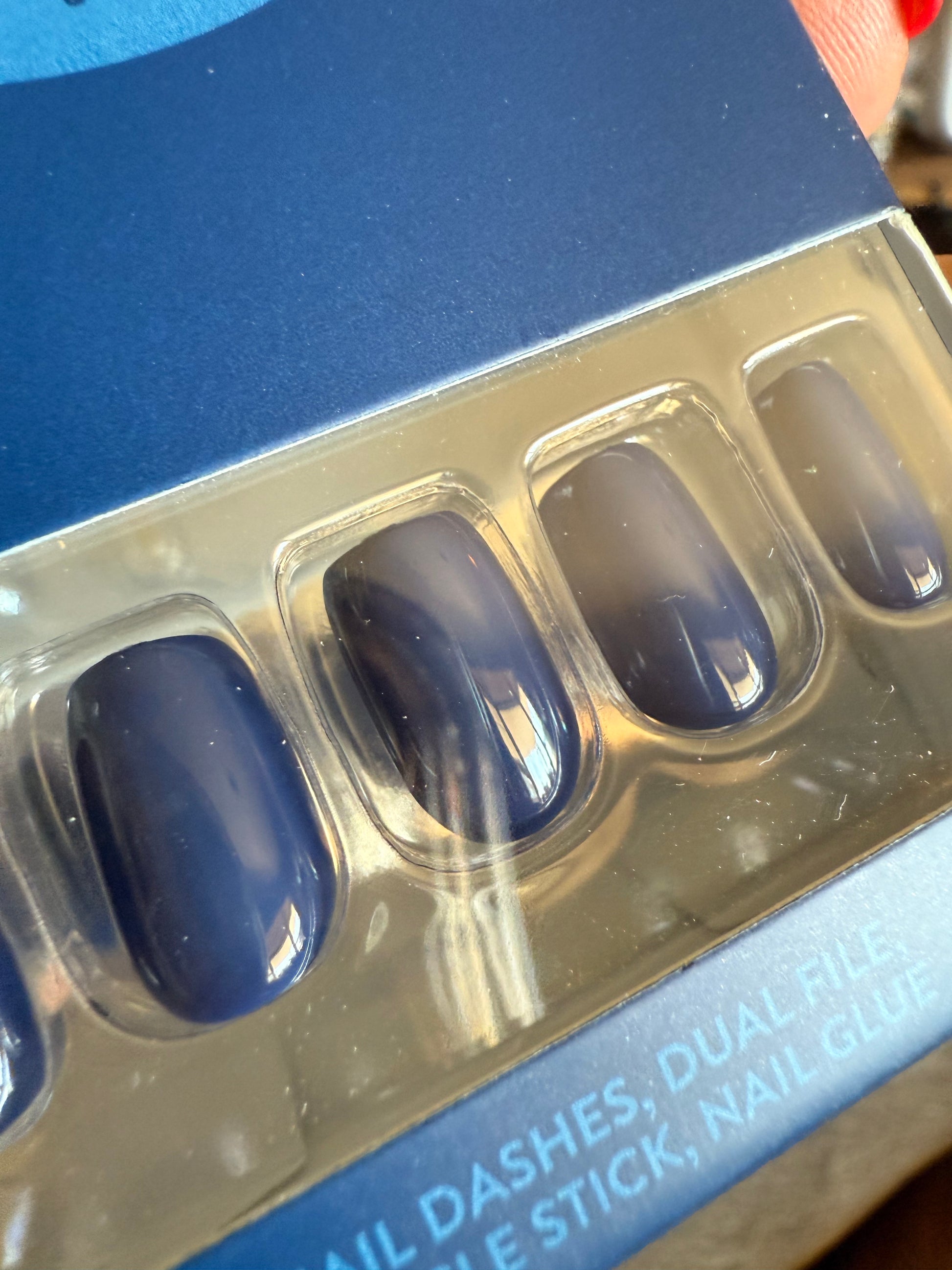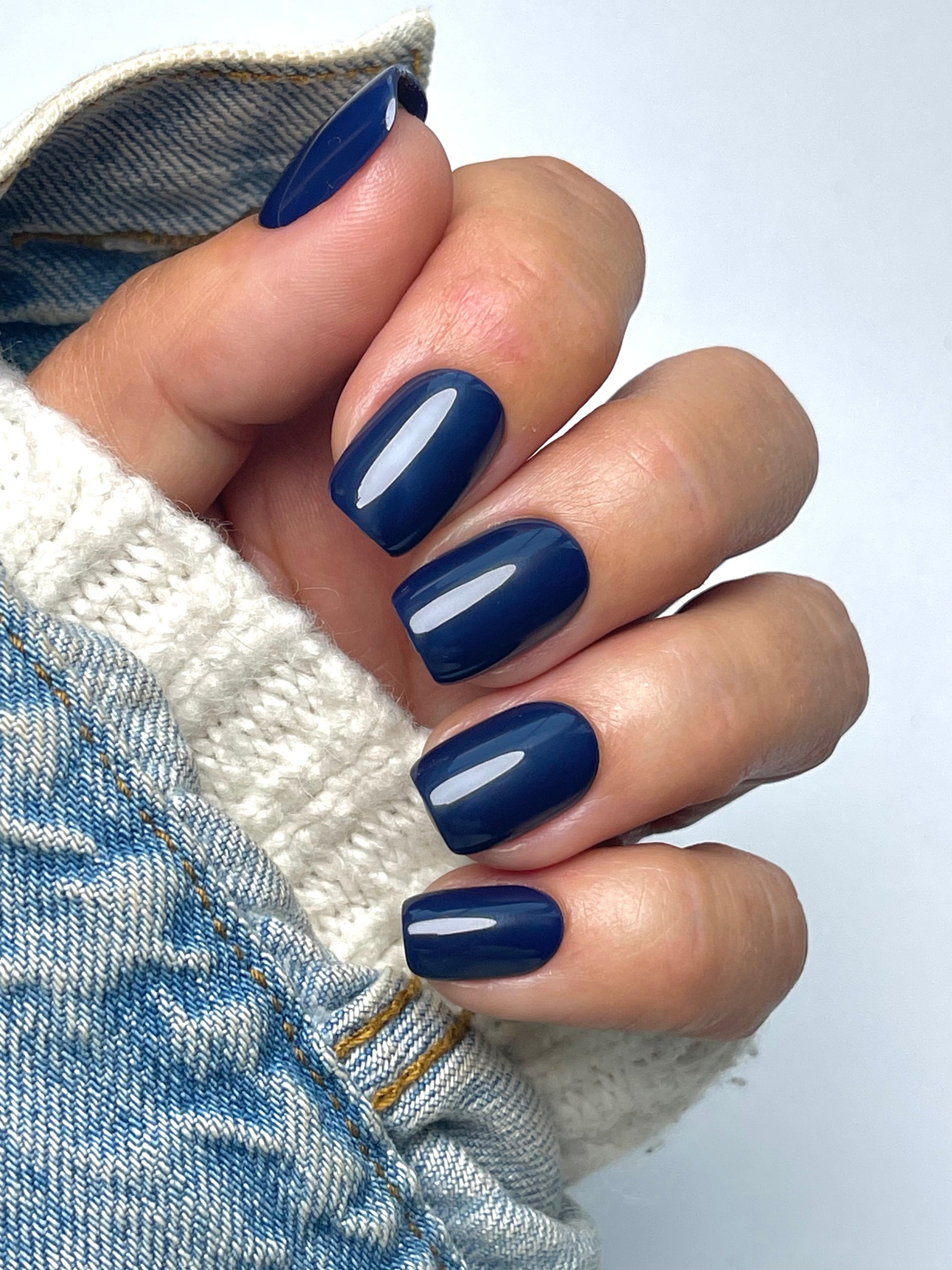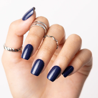 short squoval press on nails come in a blue shiny finish with an acrylic and solid nail design