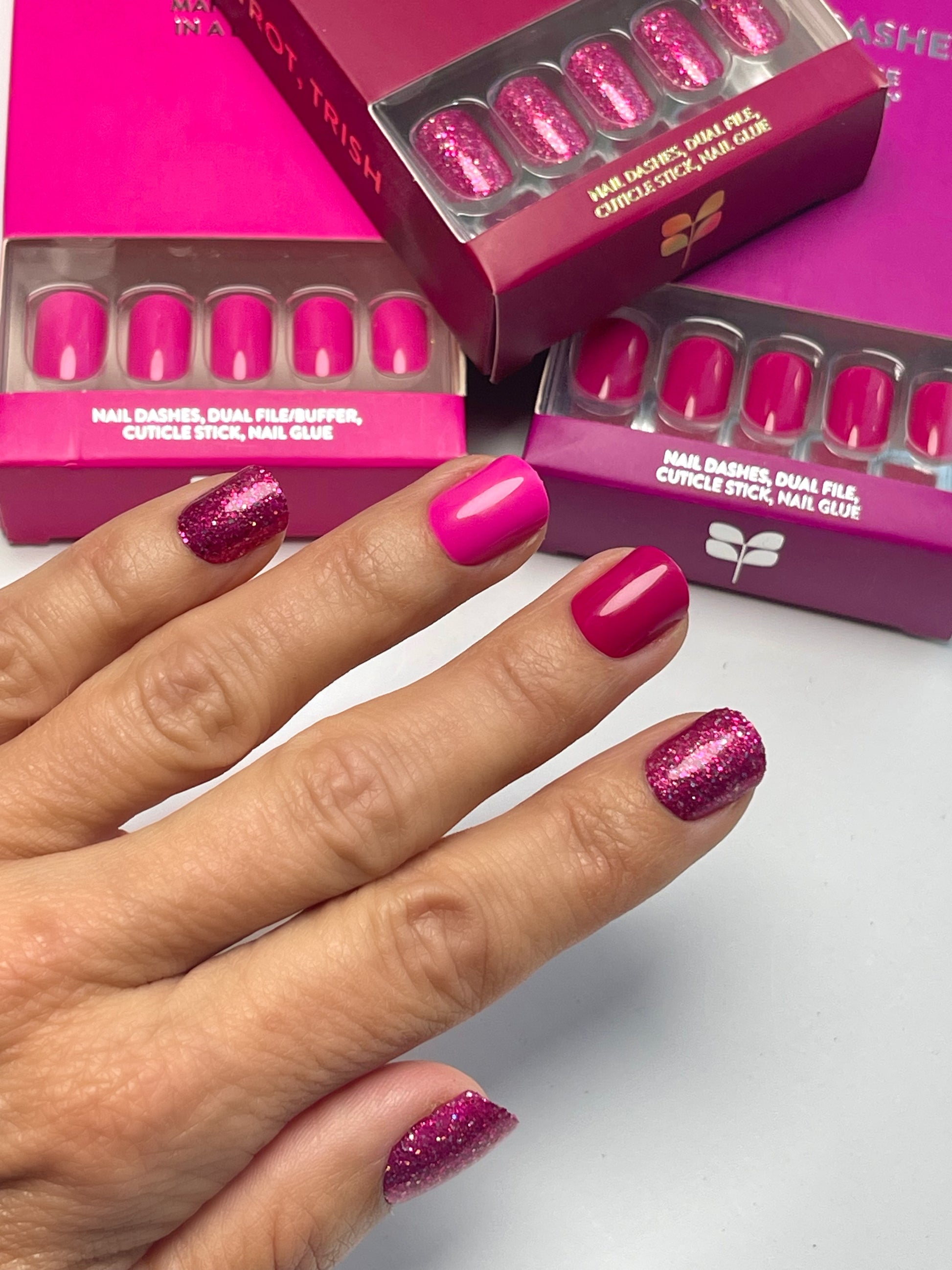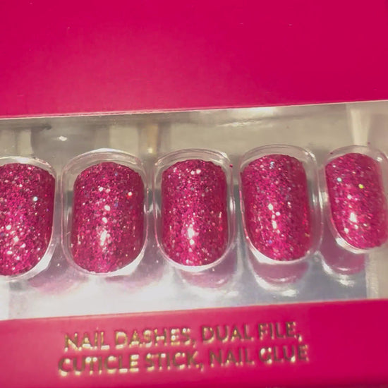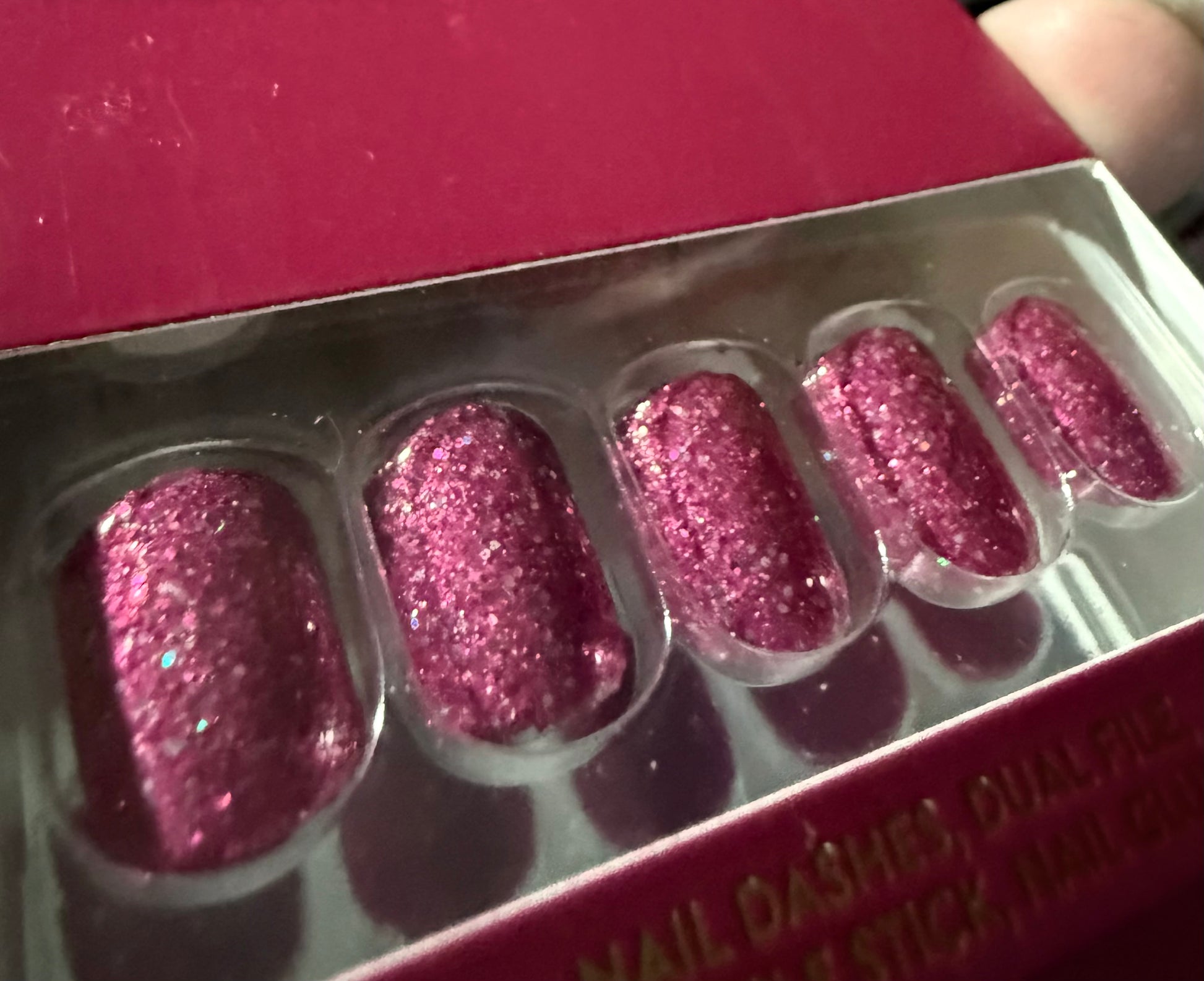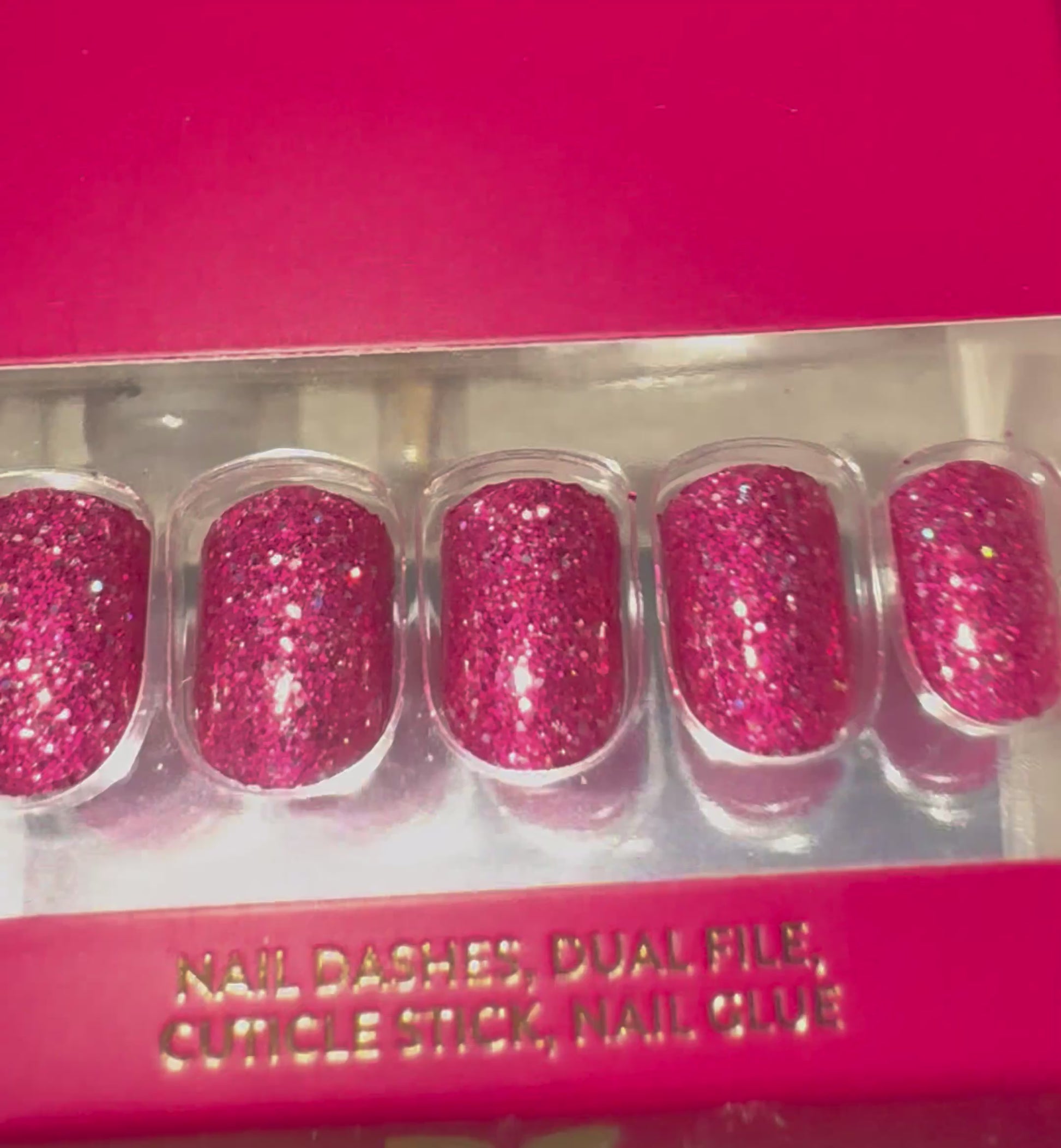 short square press on nails come in a pink shiny finish with a glitter nail design