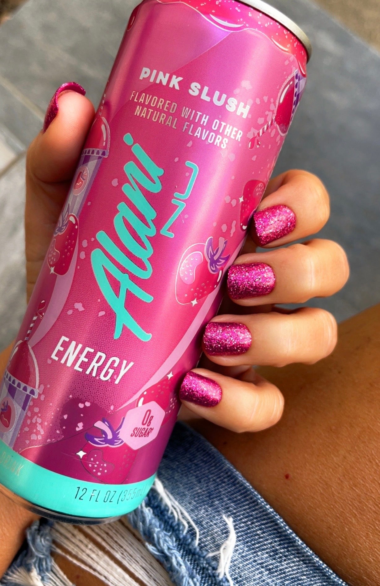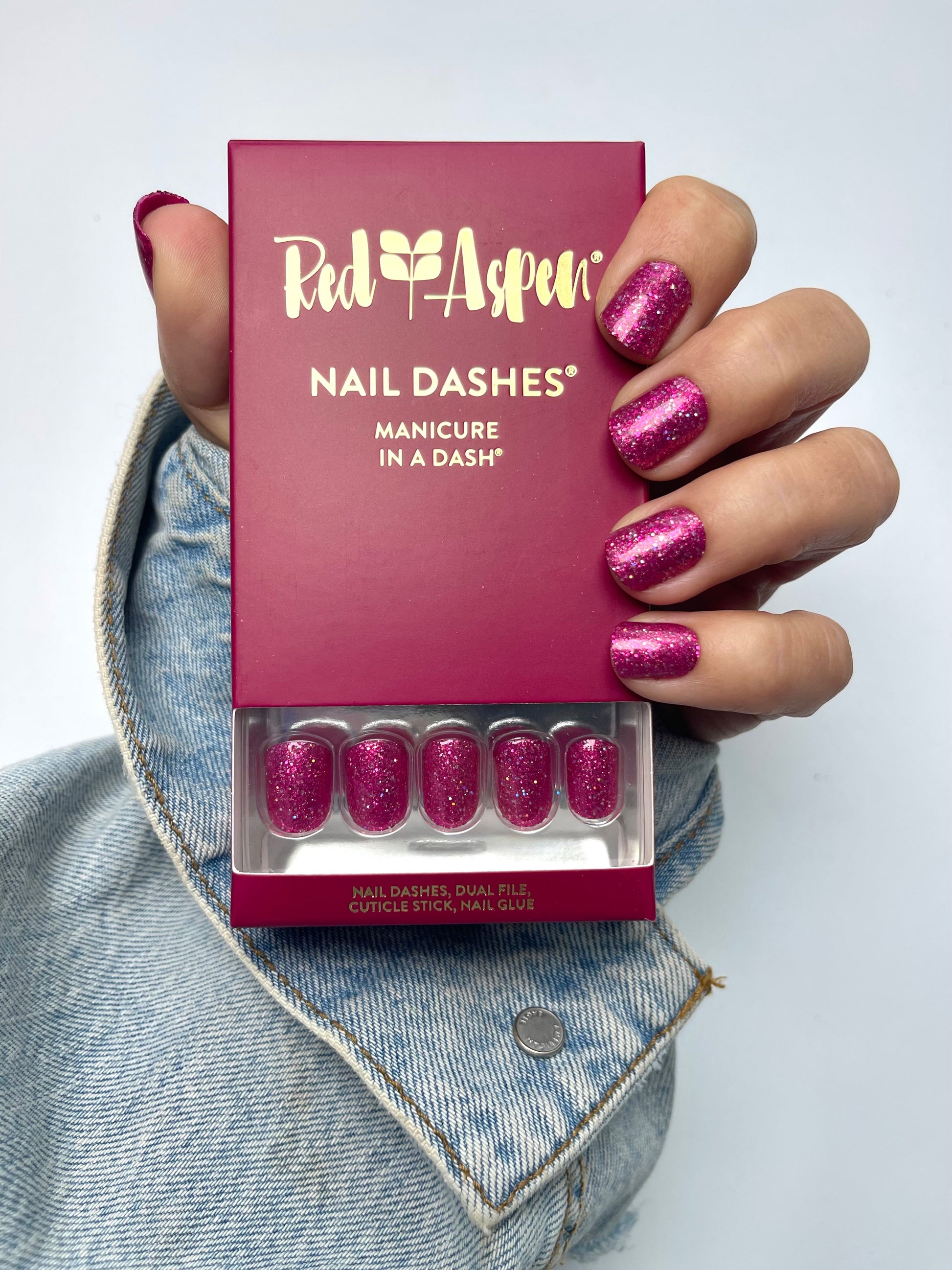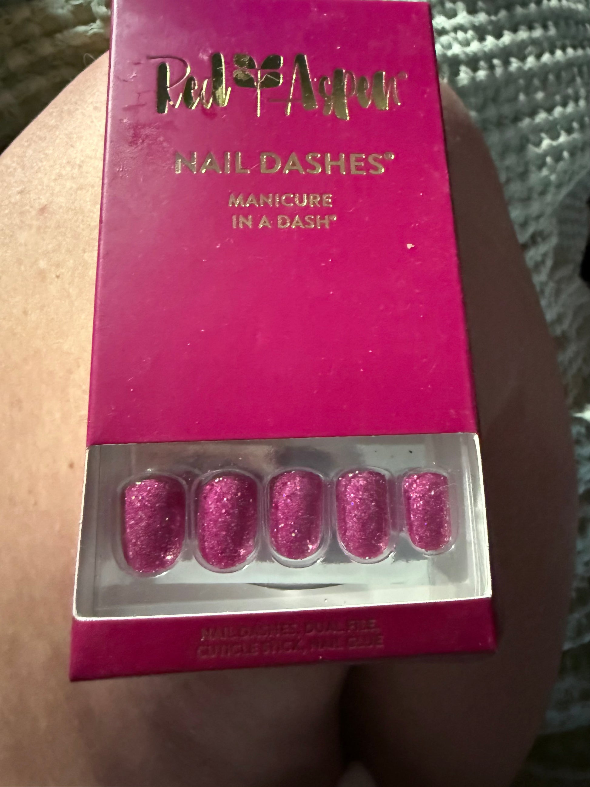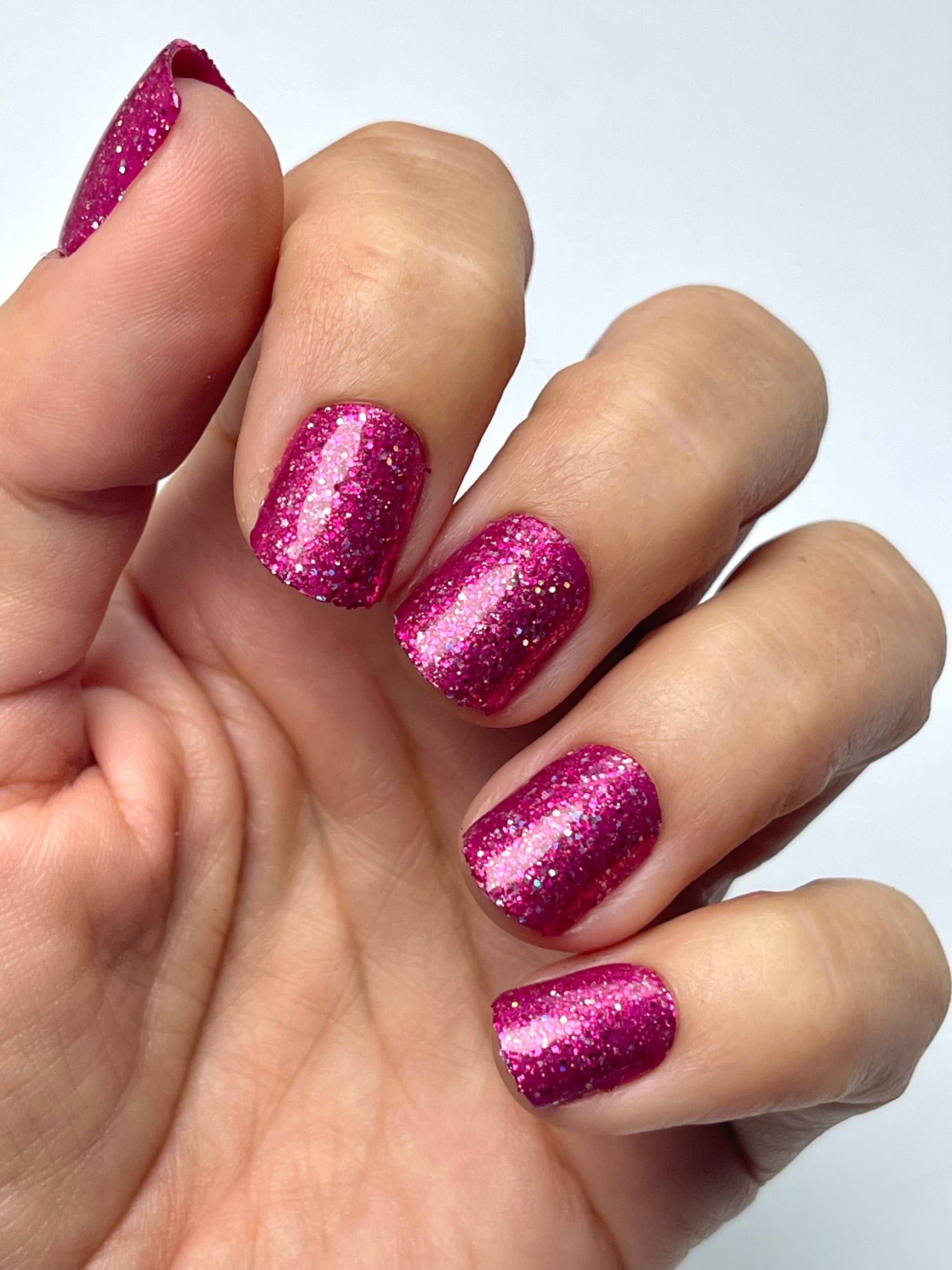 short square press on nails come in a pink shiny finish with a glitter nail design