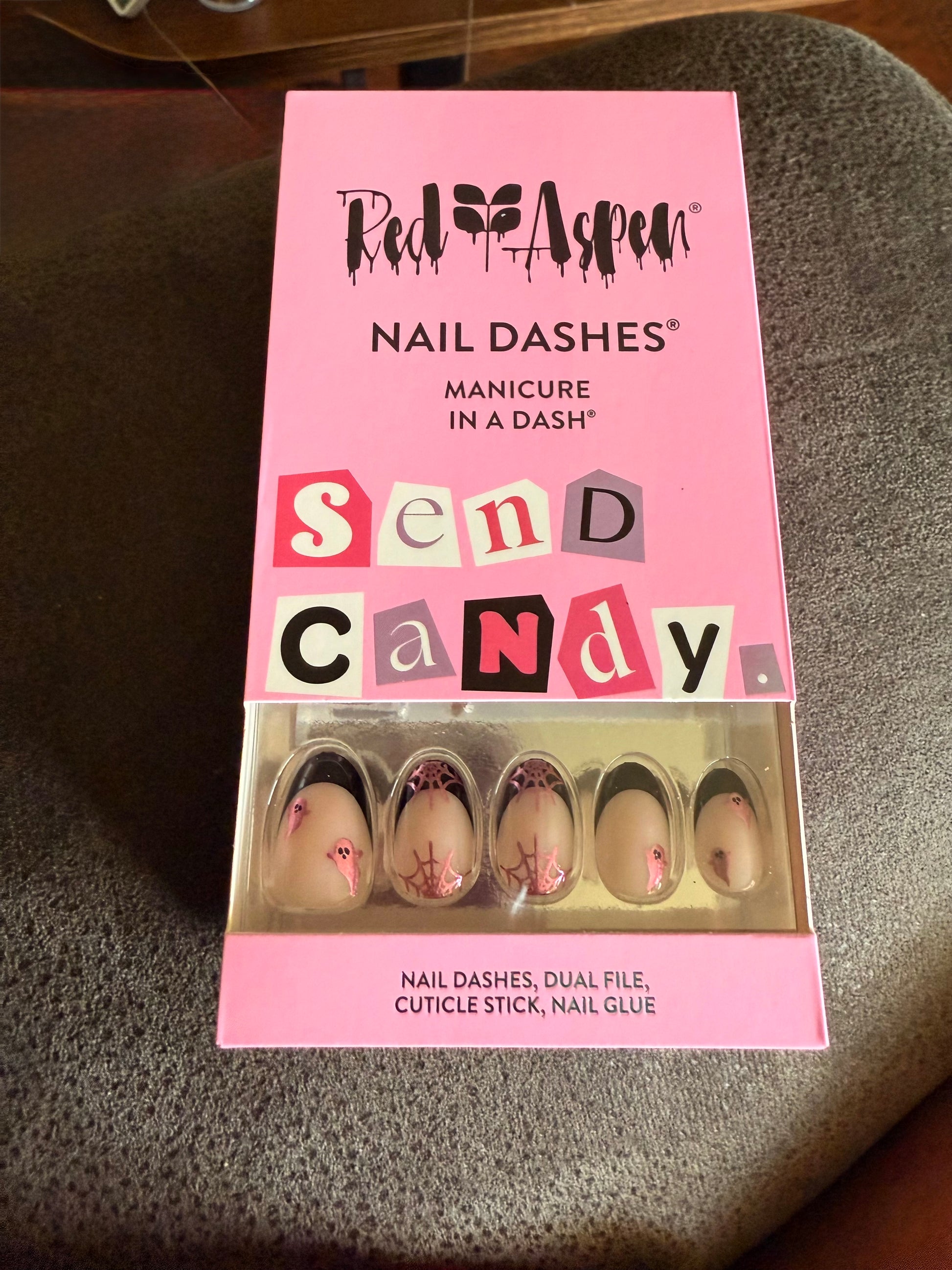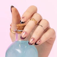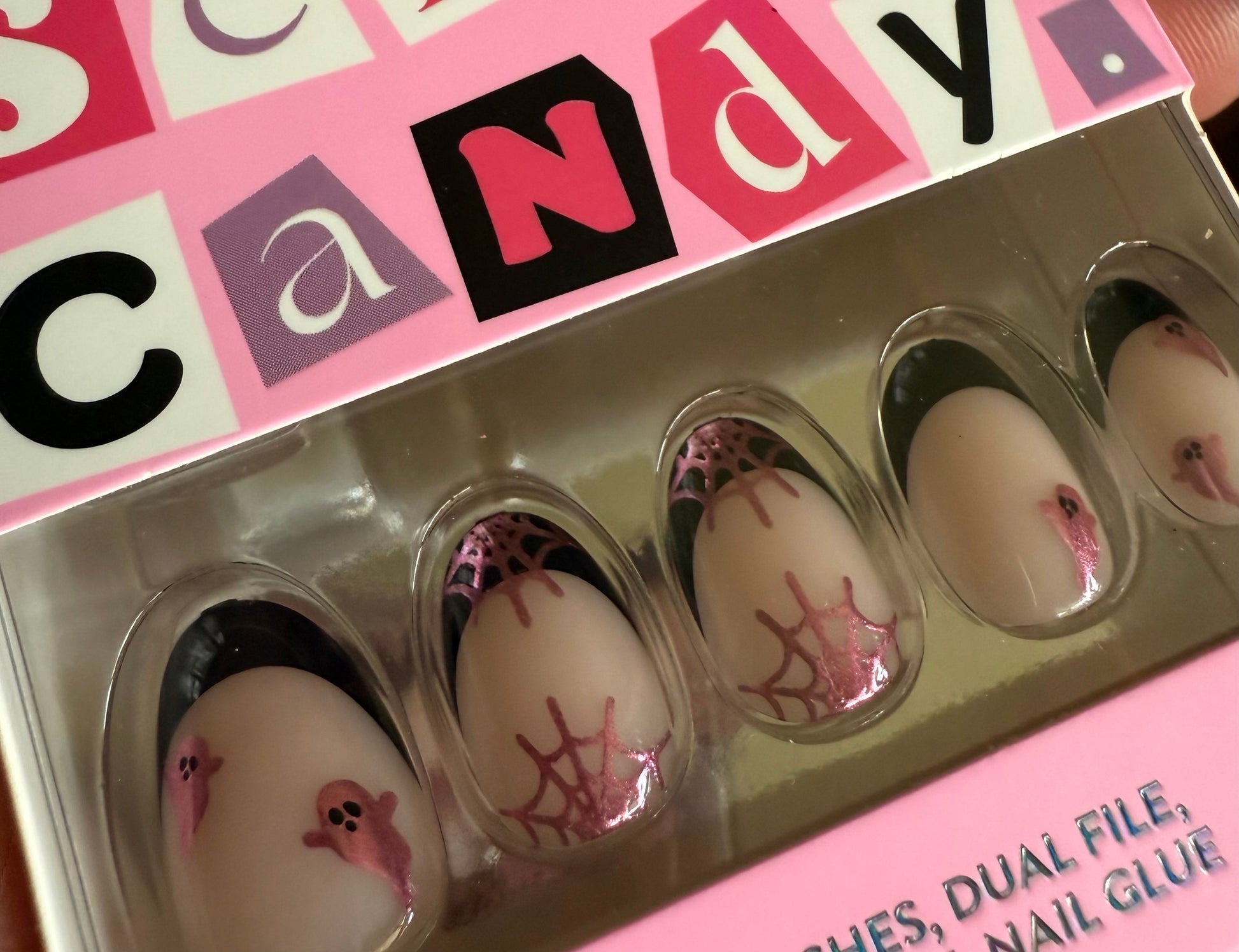 medium almond press on nails come in a black and pink shiny finish with a Halloween and french nail design.