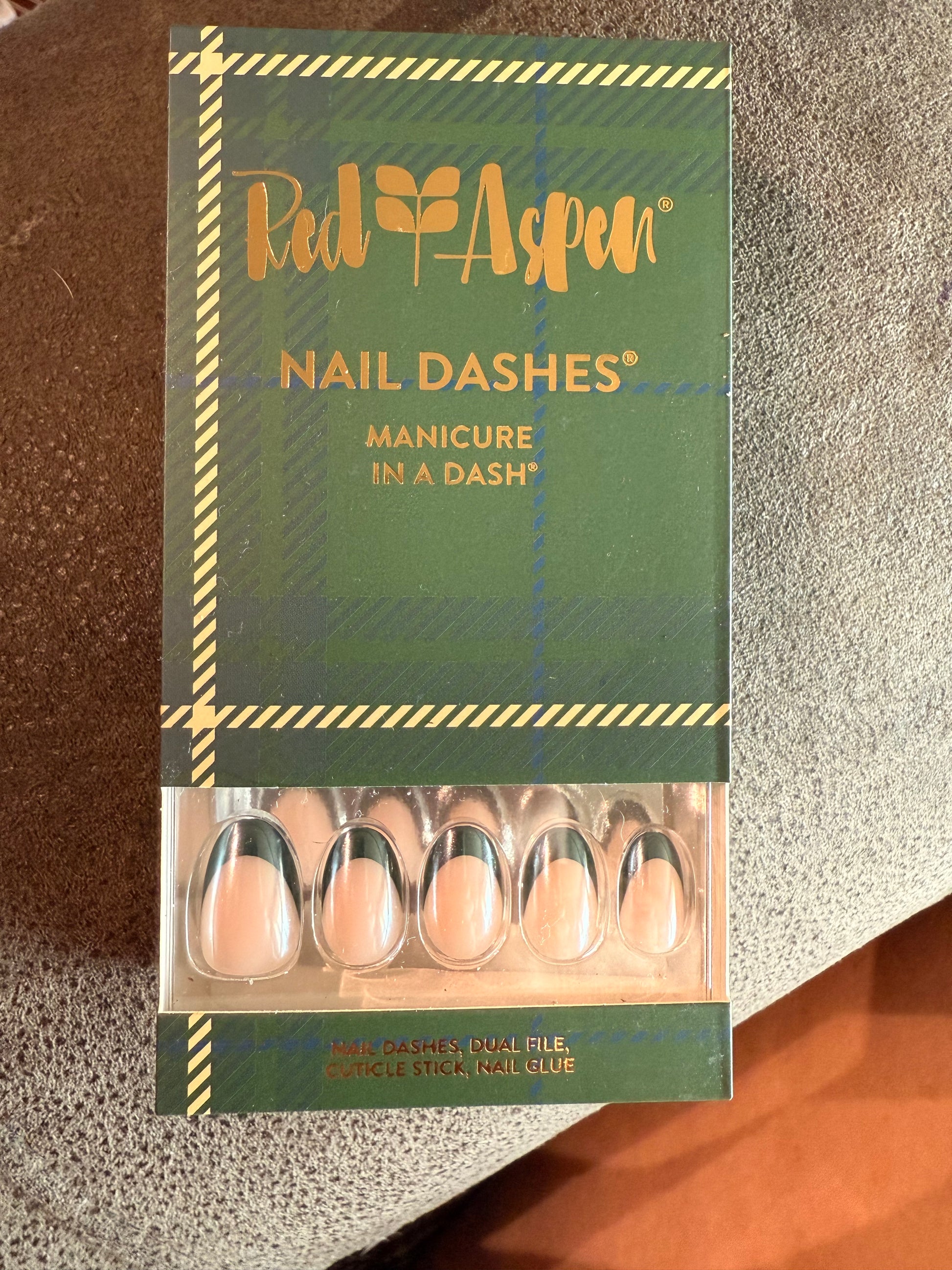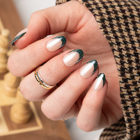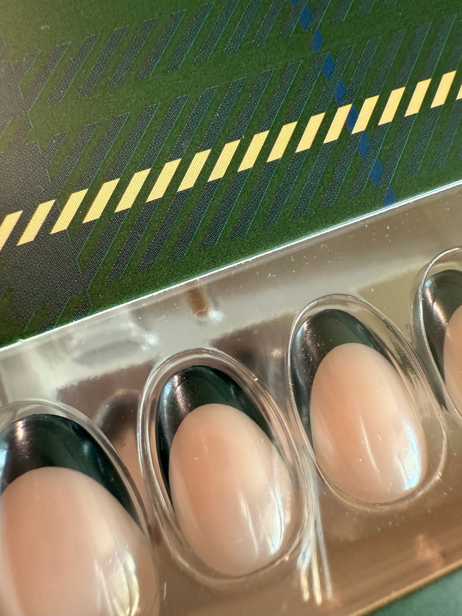 short almond press on nails come in a green shiny finish with a french and glazed nail design.