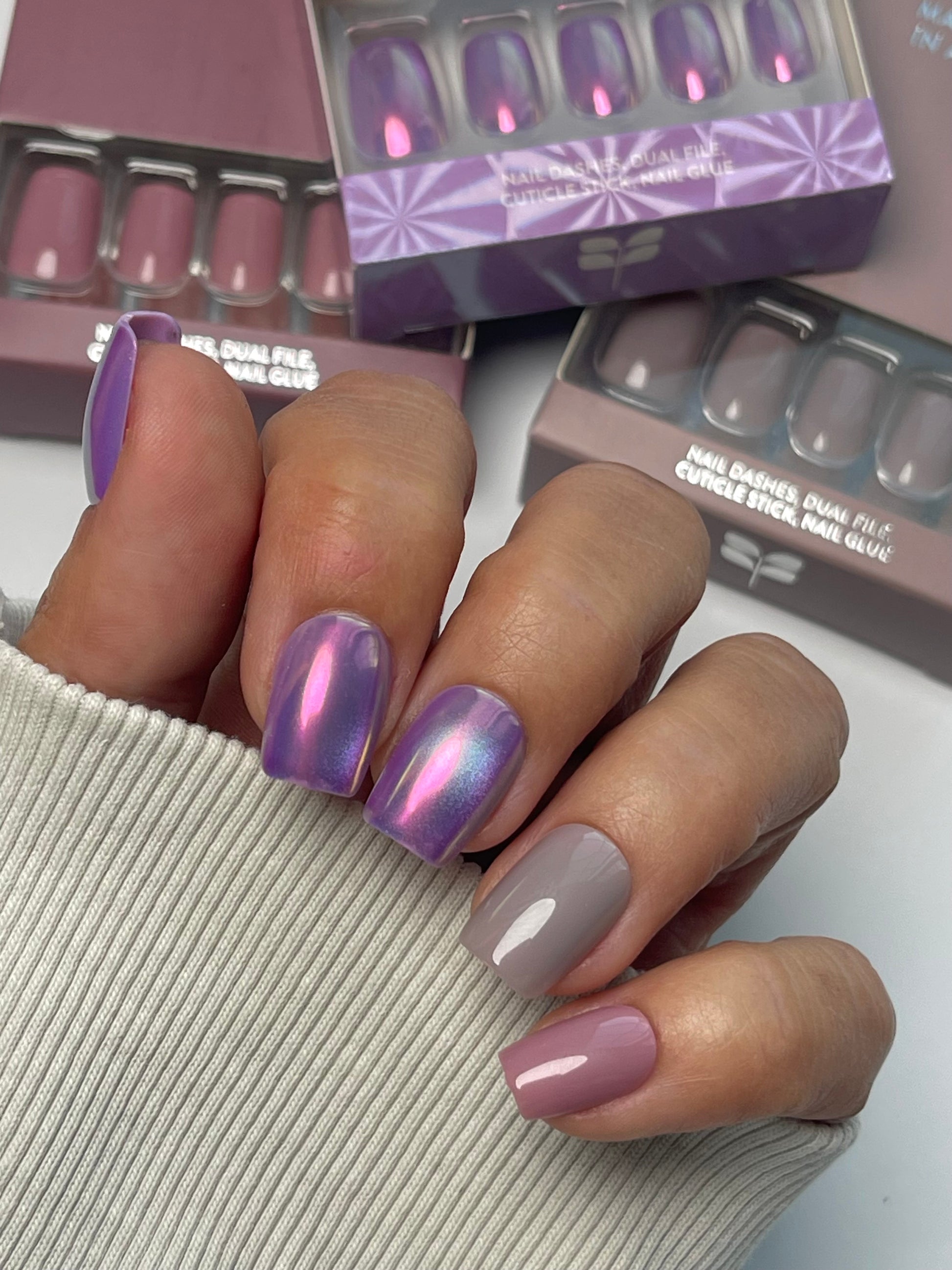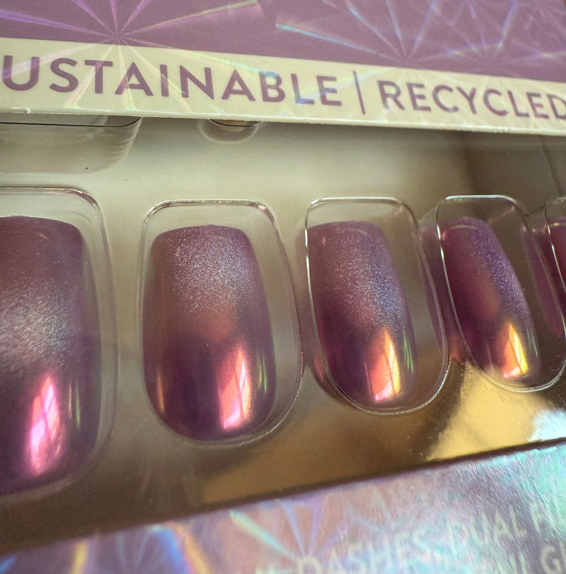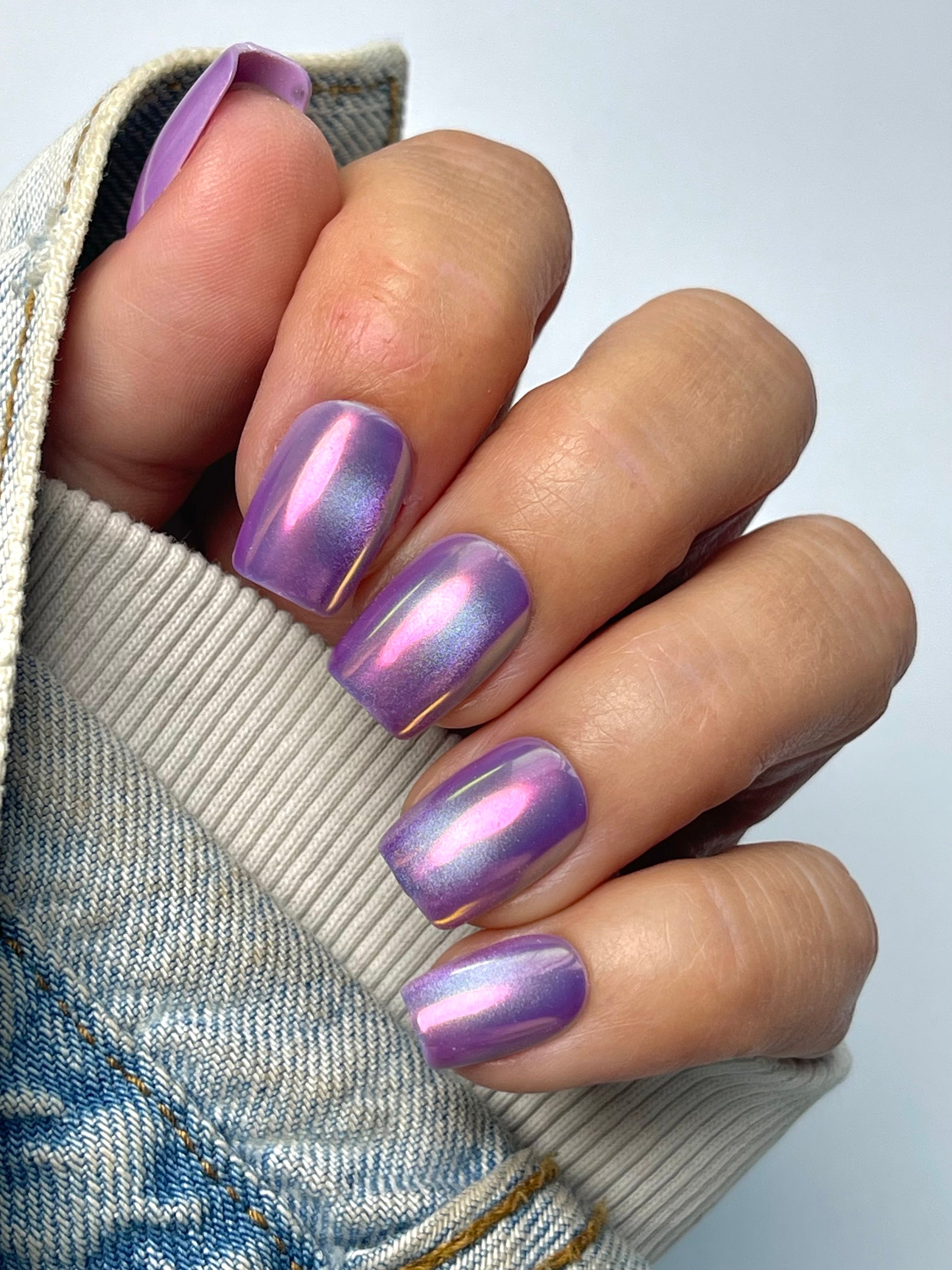 ย short coffin press on nails come in a pink and purple shiny finish with a cat eye and holographic nail design