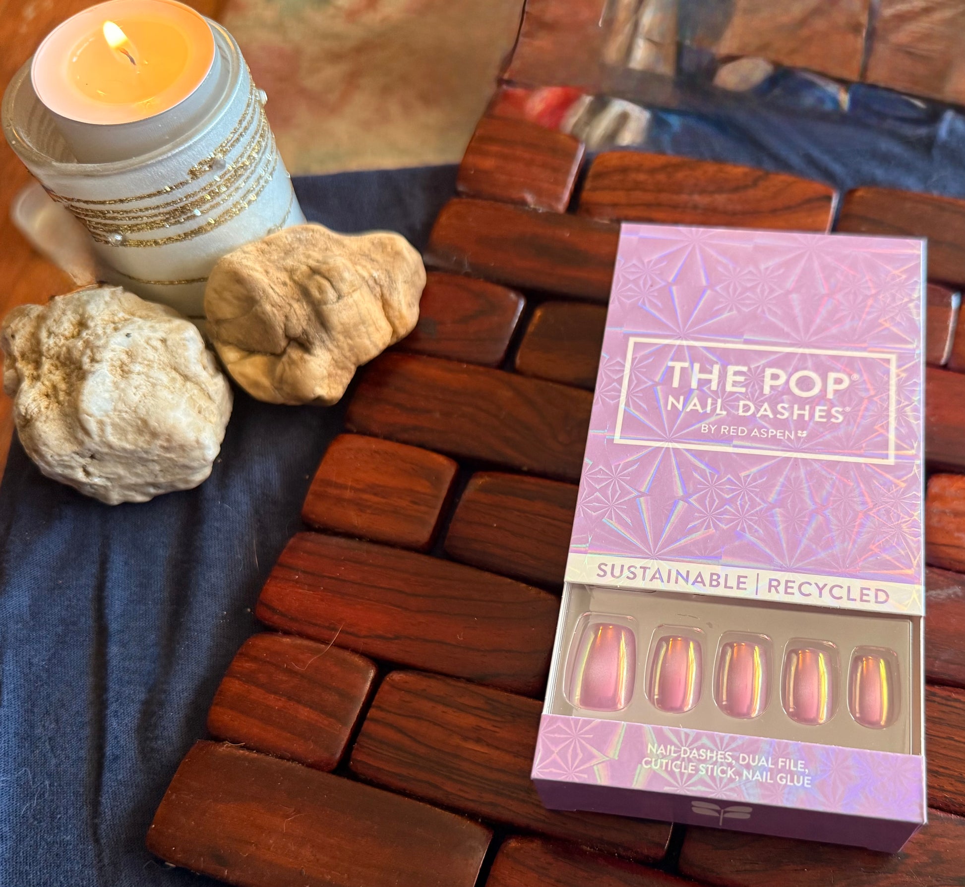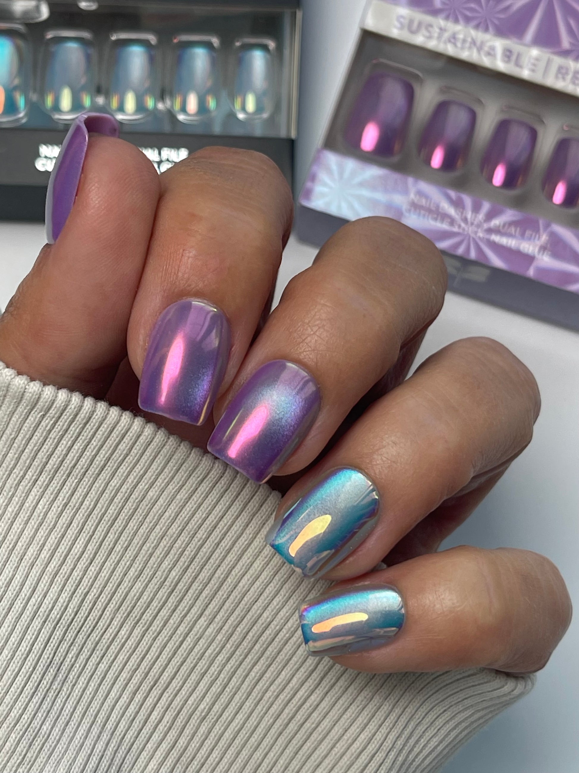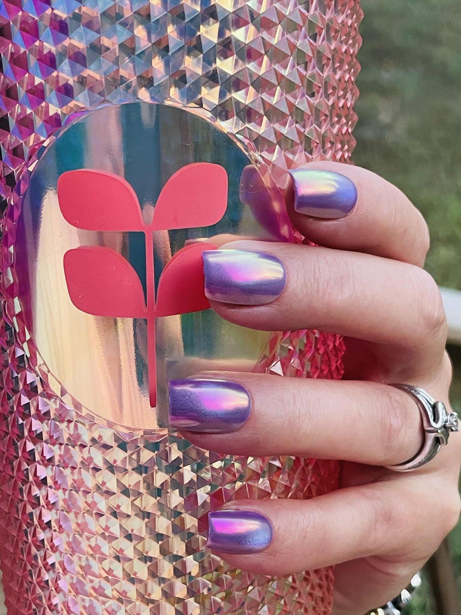 ย short coffin press on nails come in a pink and purple shiny finish with a cat eye and holographic nail design