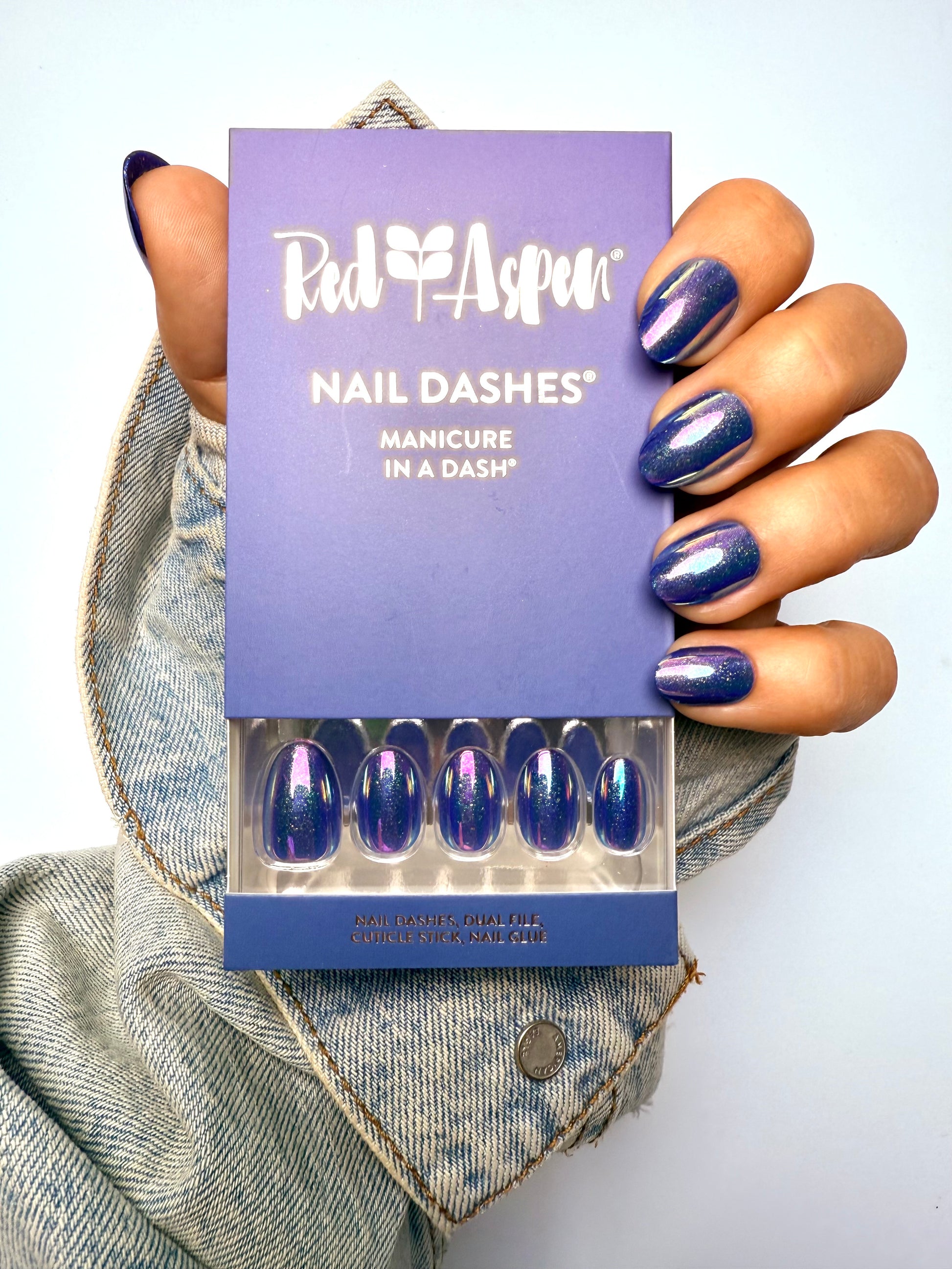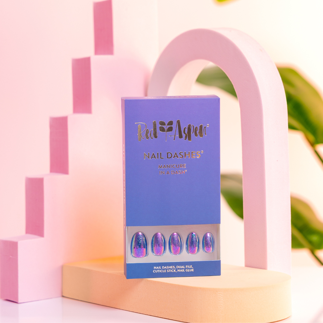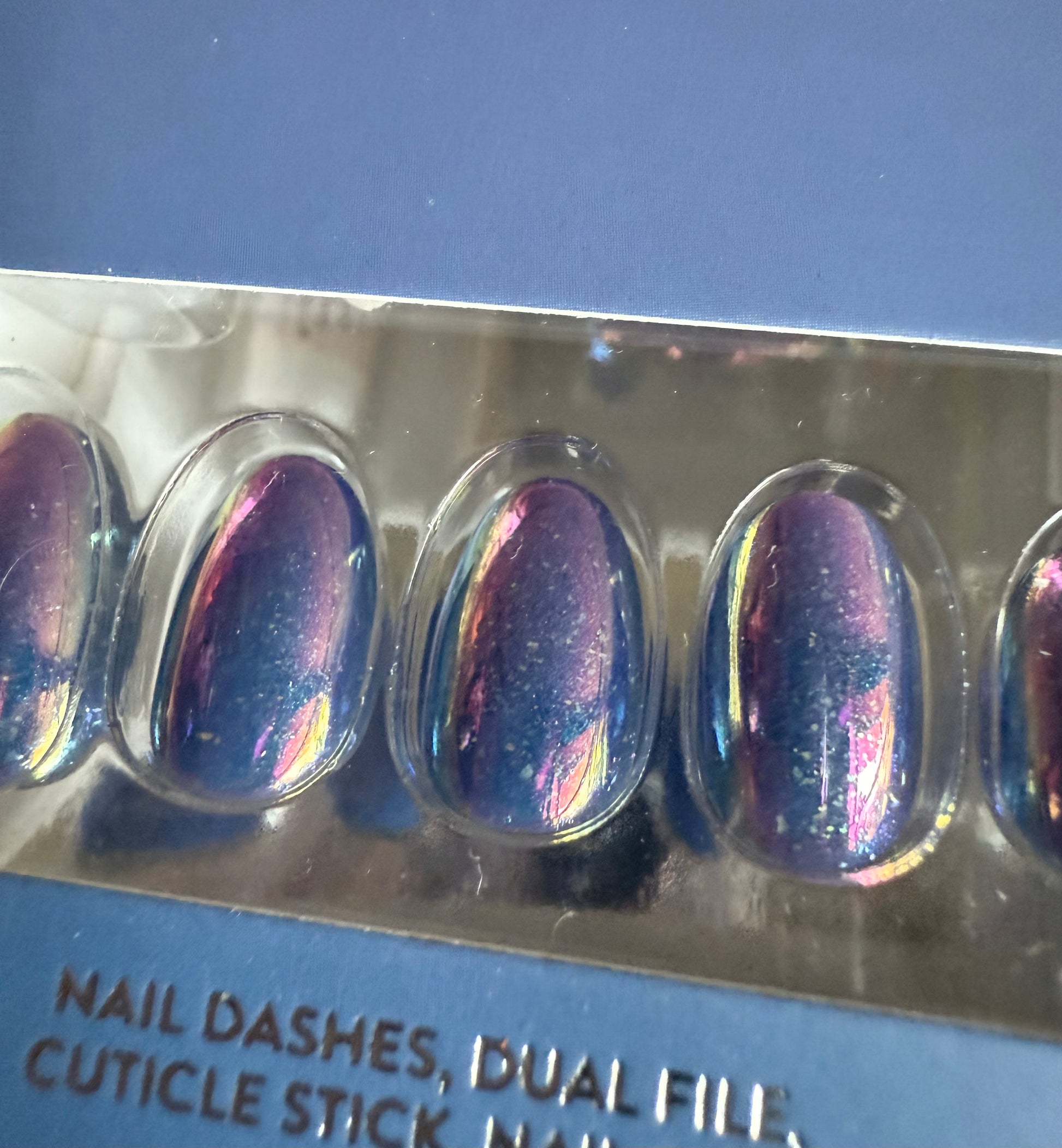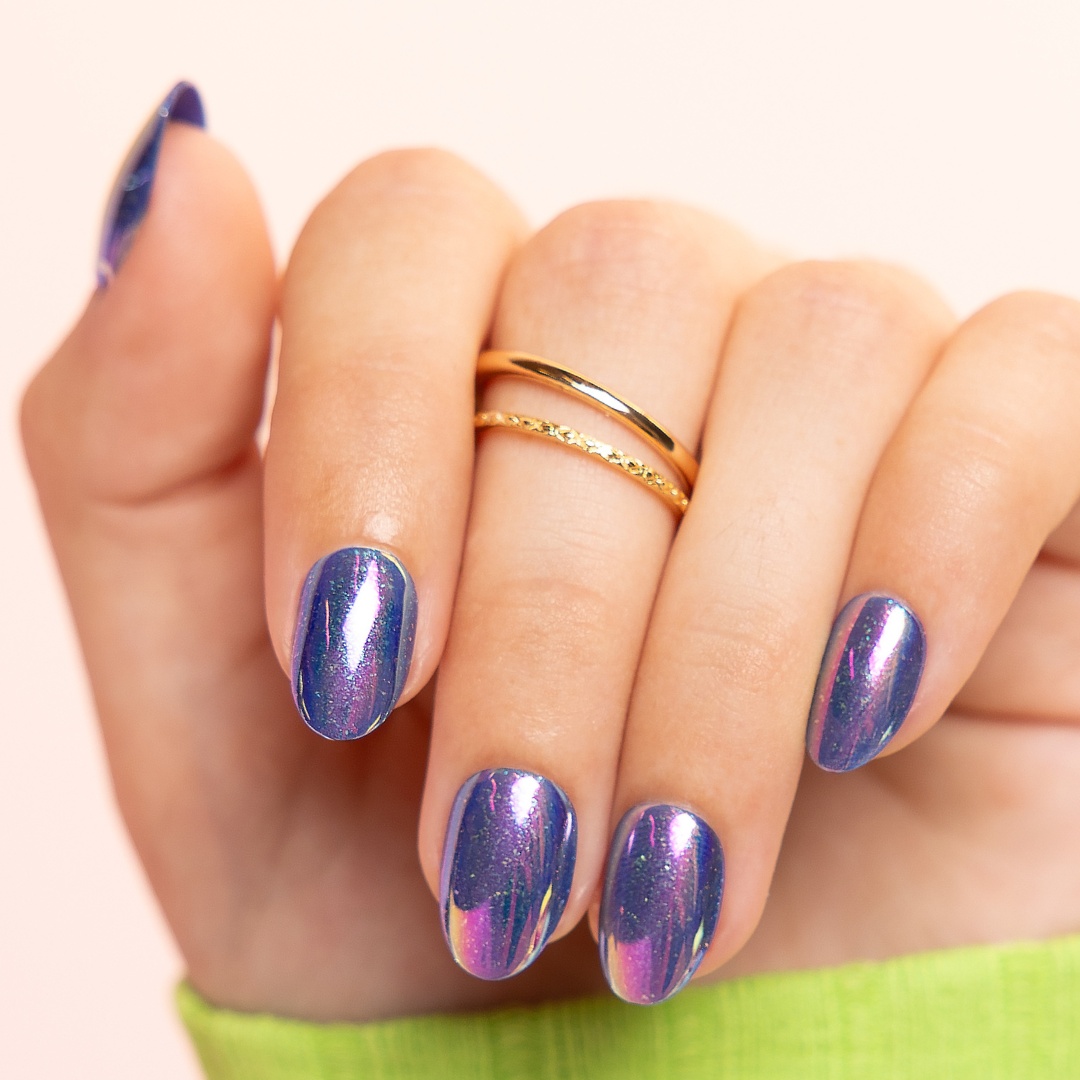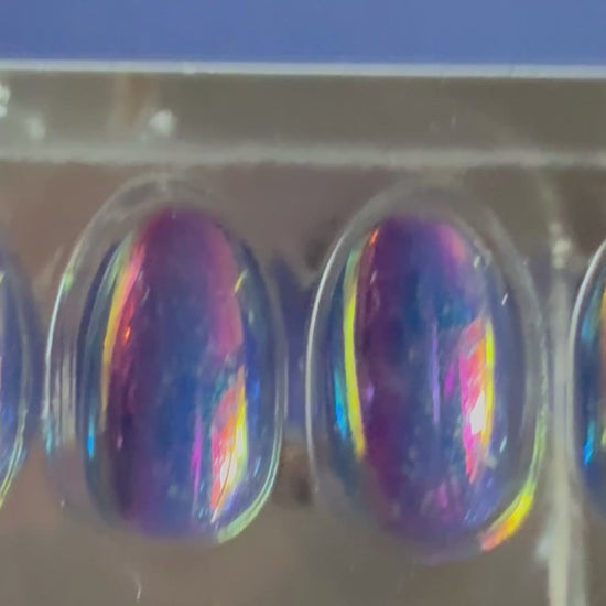 short almond press on nails come in a purple shiny finish with a glitter and holographic nail design.