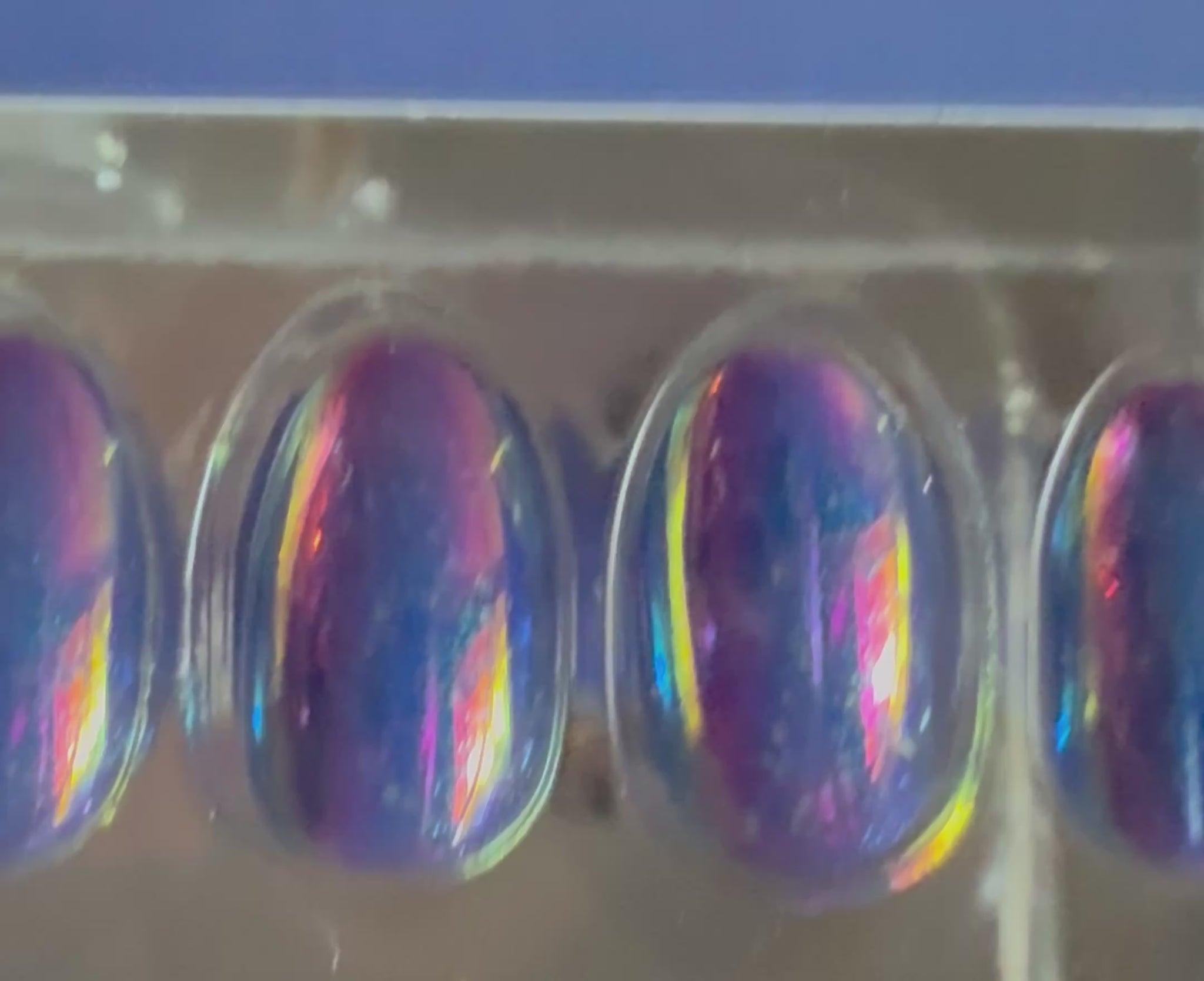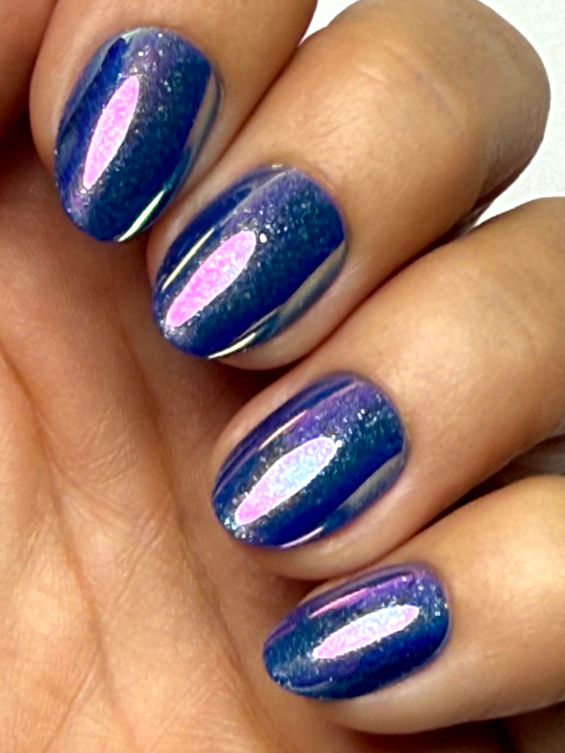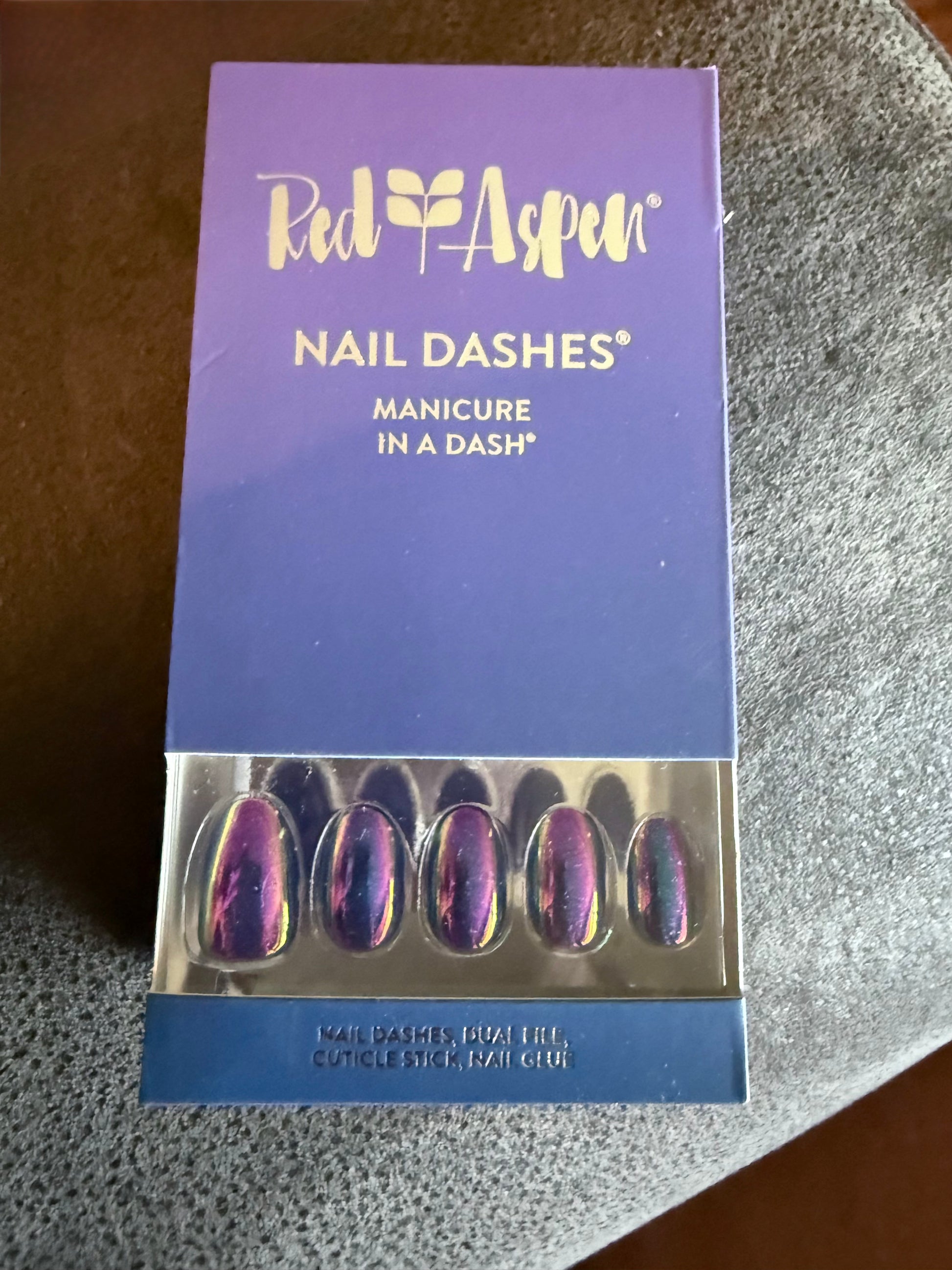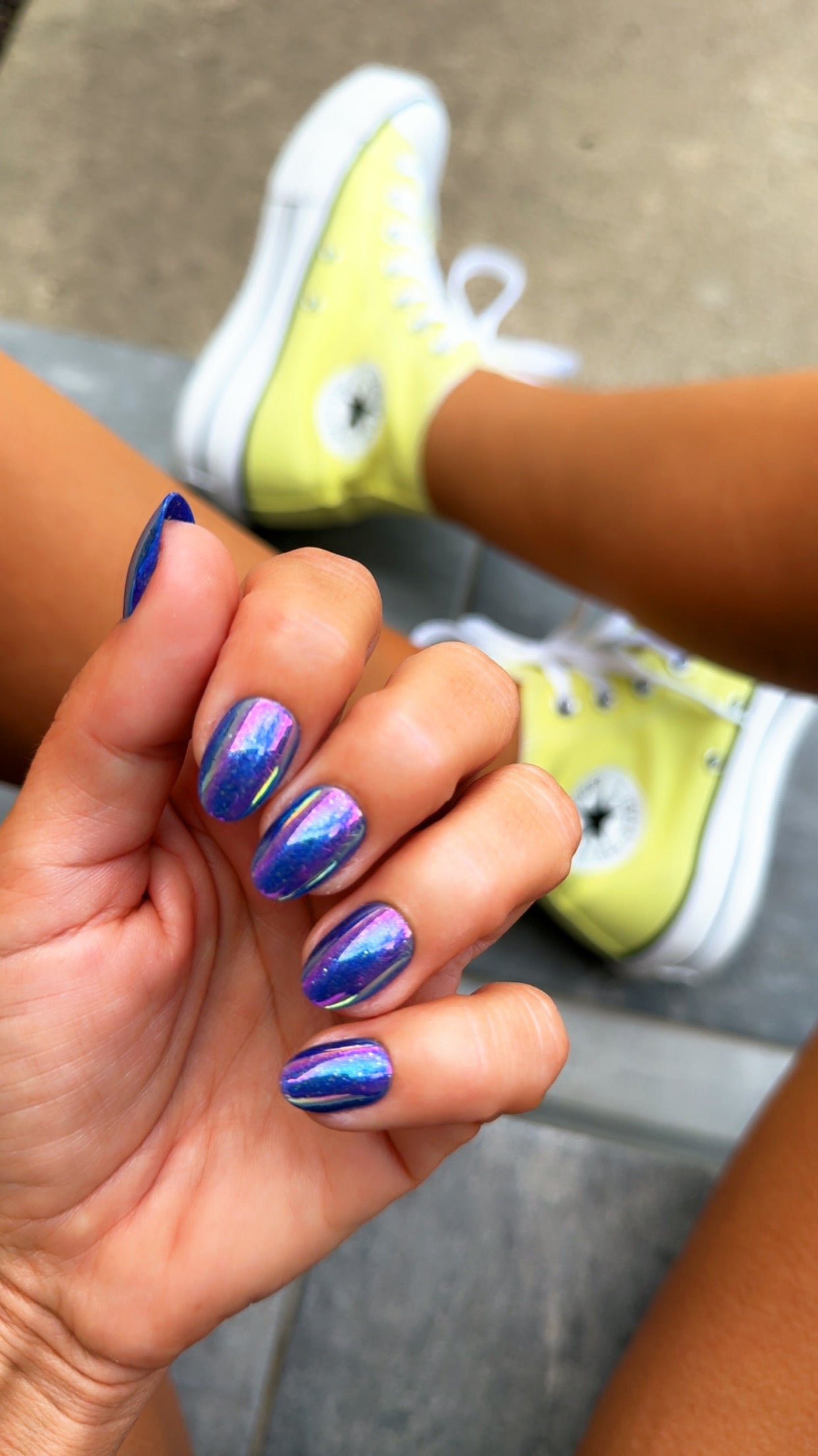 short almond press on nails come in a purple shiny finish with a glitter and holographic nail design.