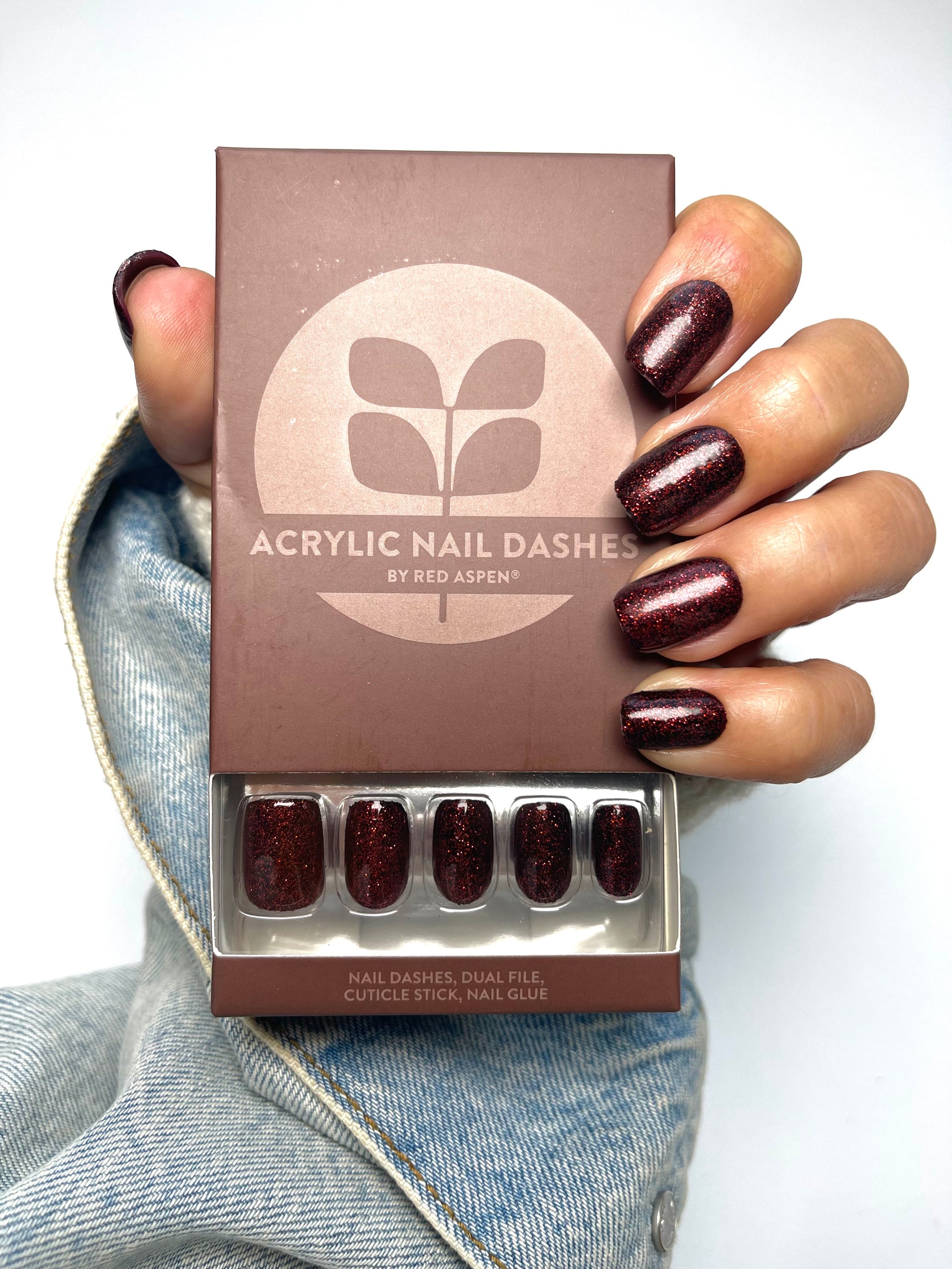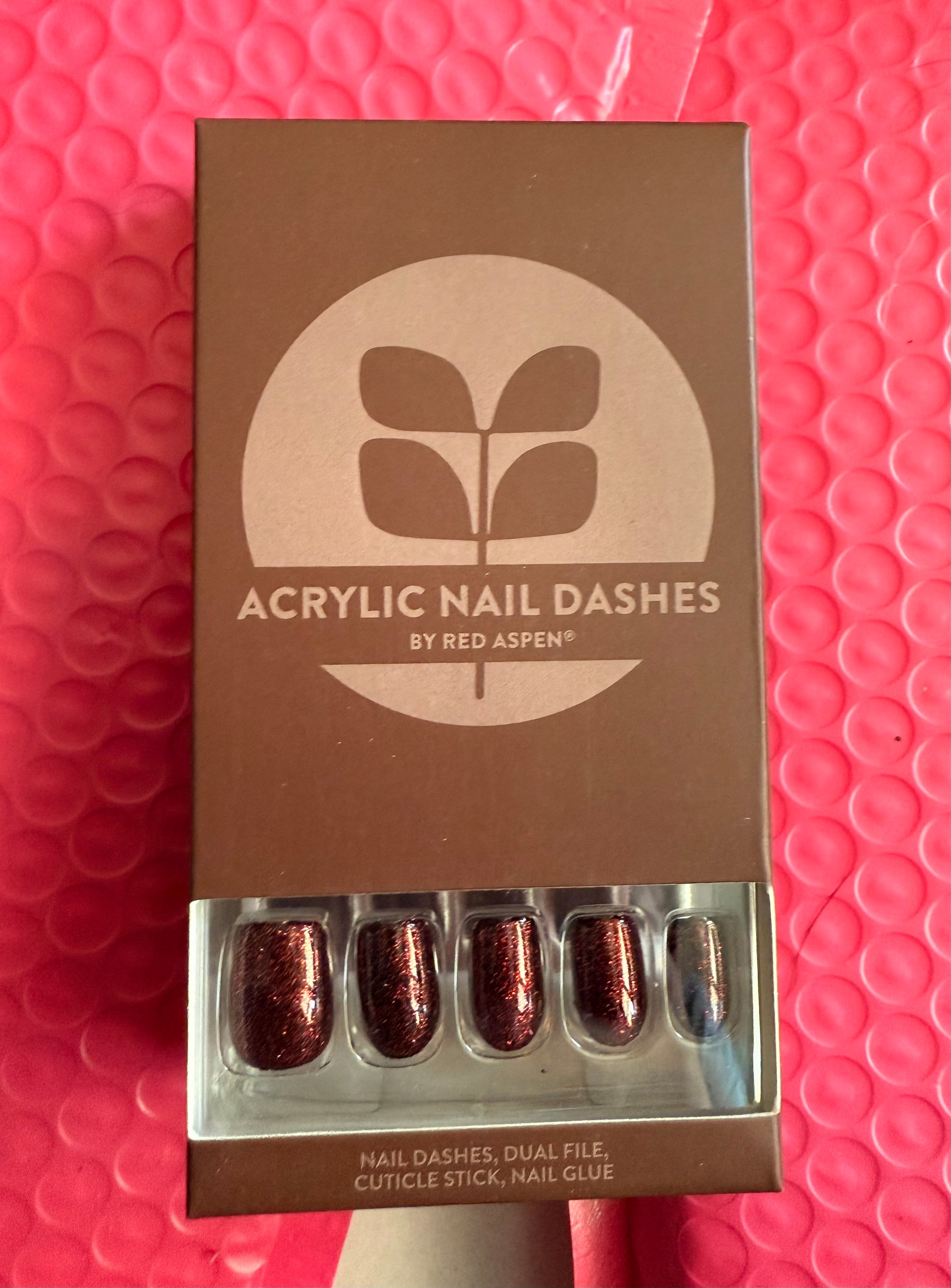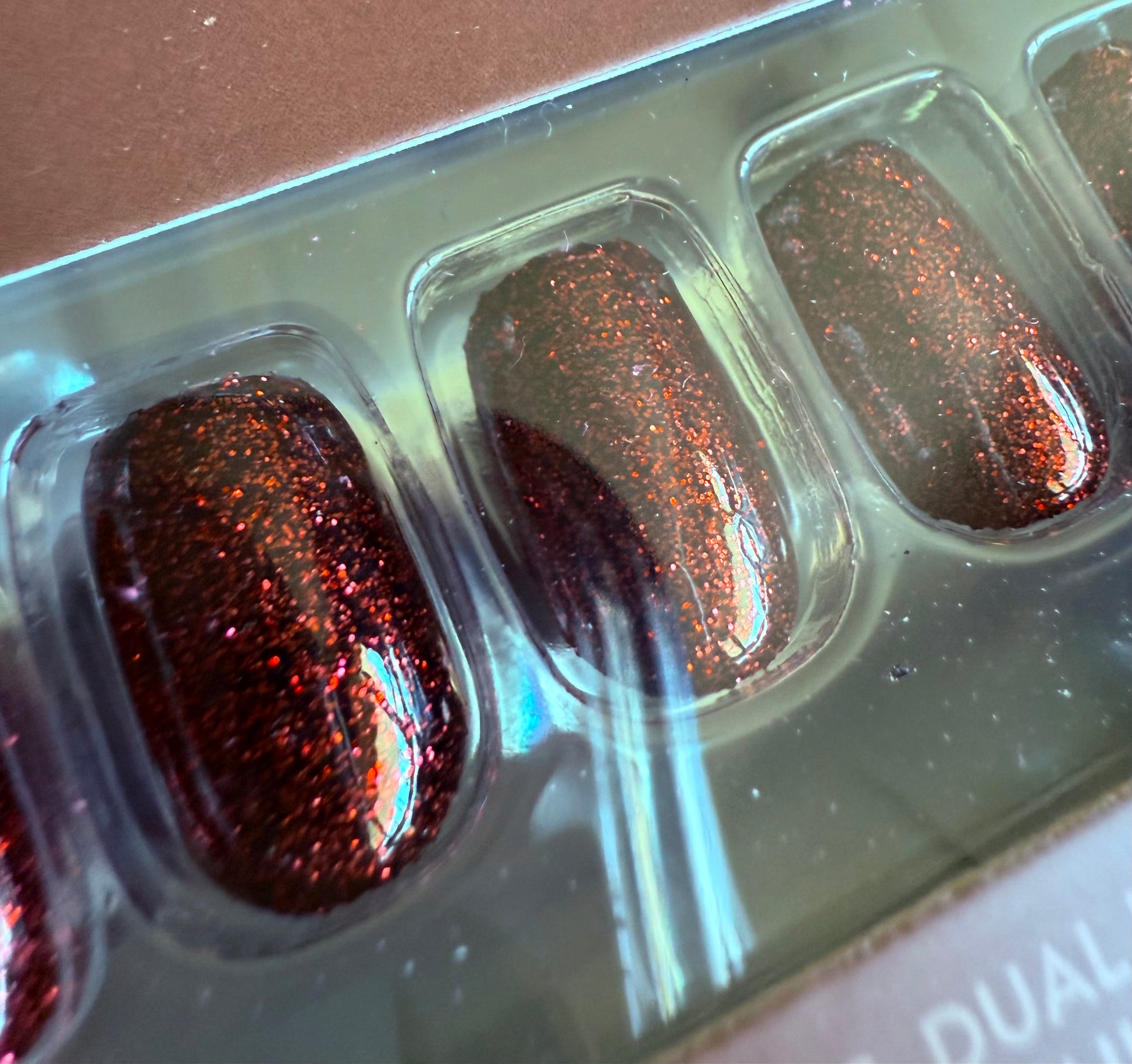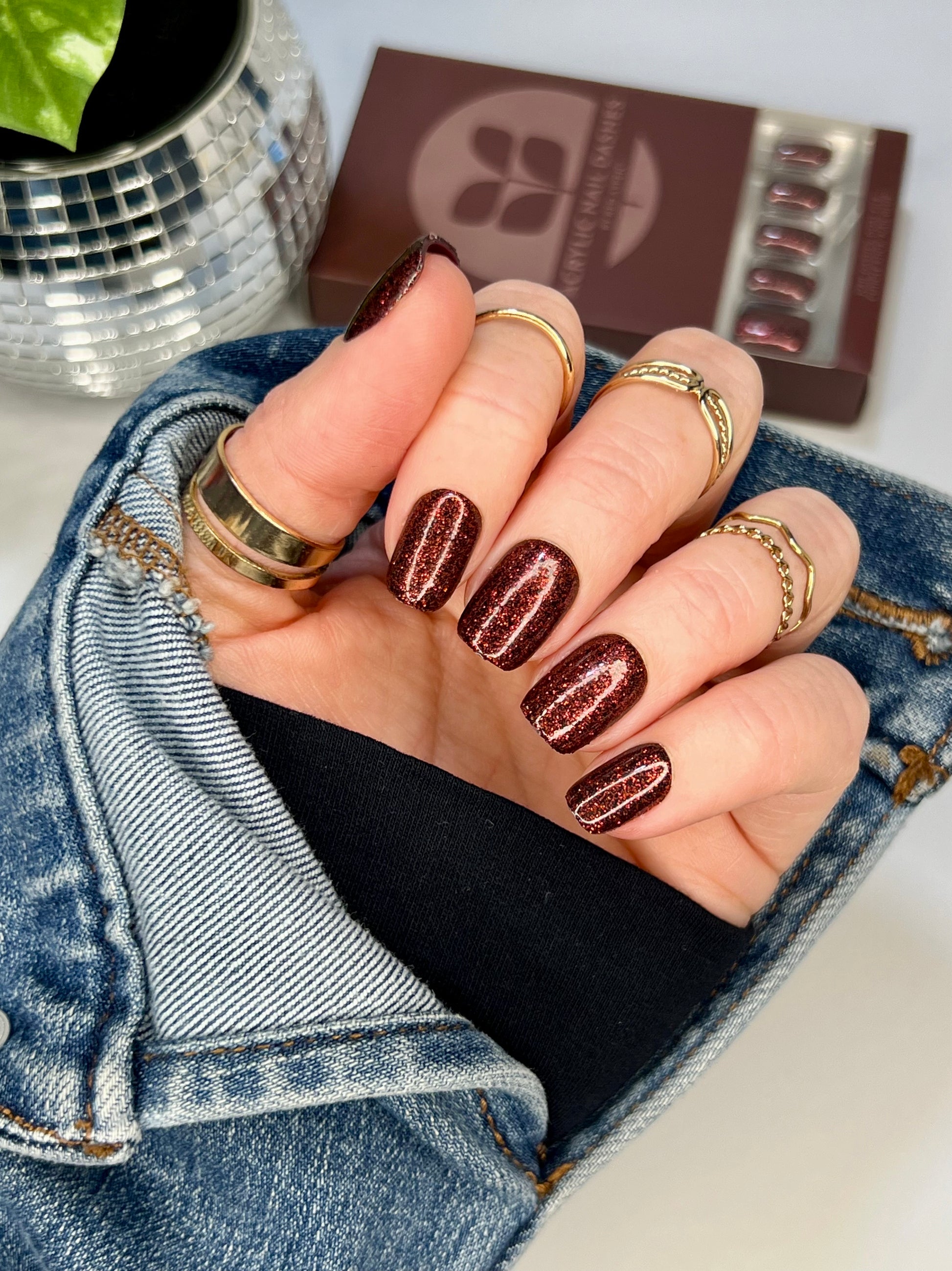 short squoval press on nails come in a brown shiny finish with an acrylic and glitter nail design