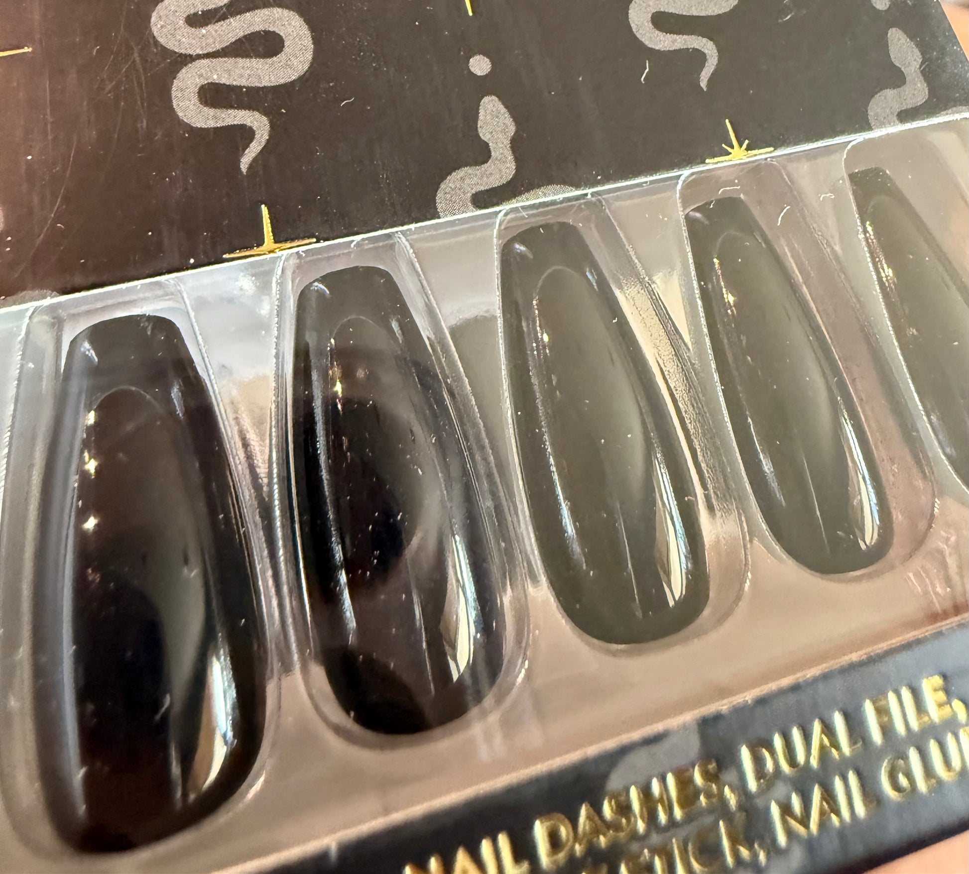 extra long ballerina press on nails come in a black shiny finish with a solid nail design.