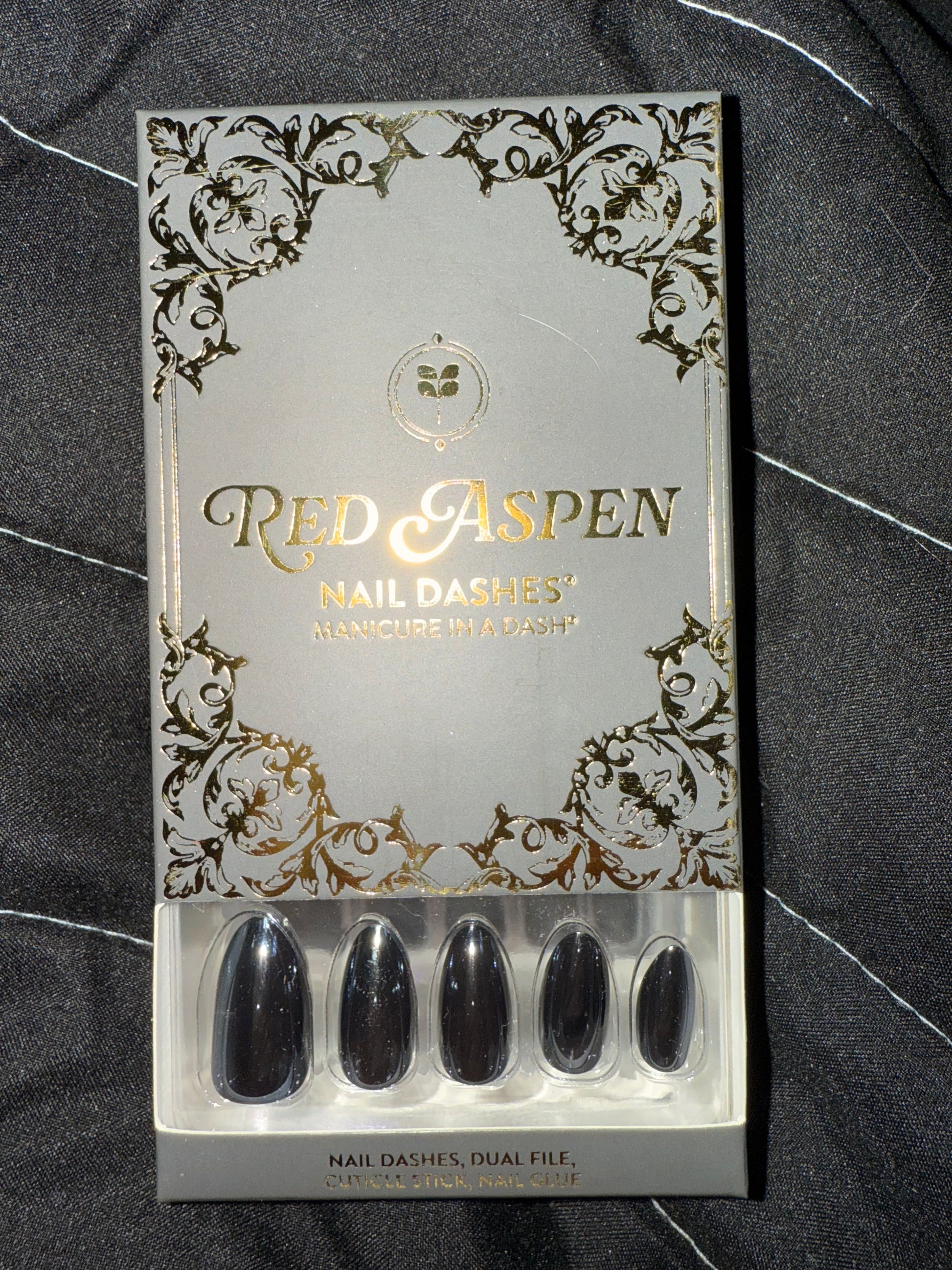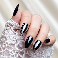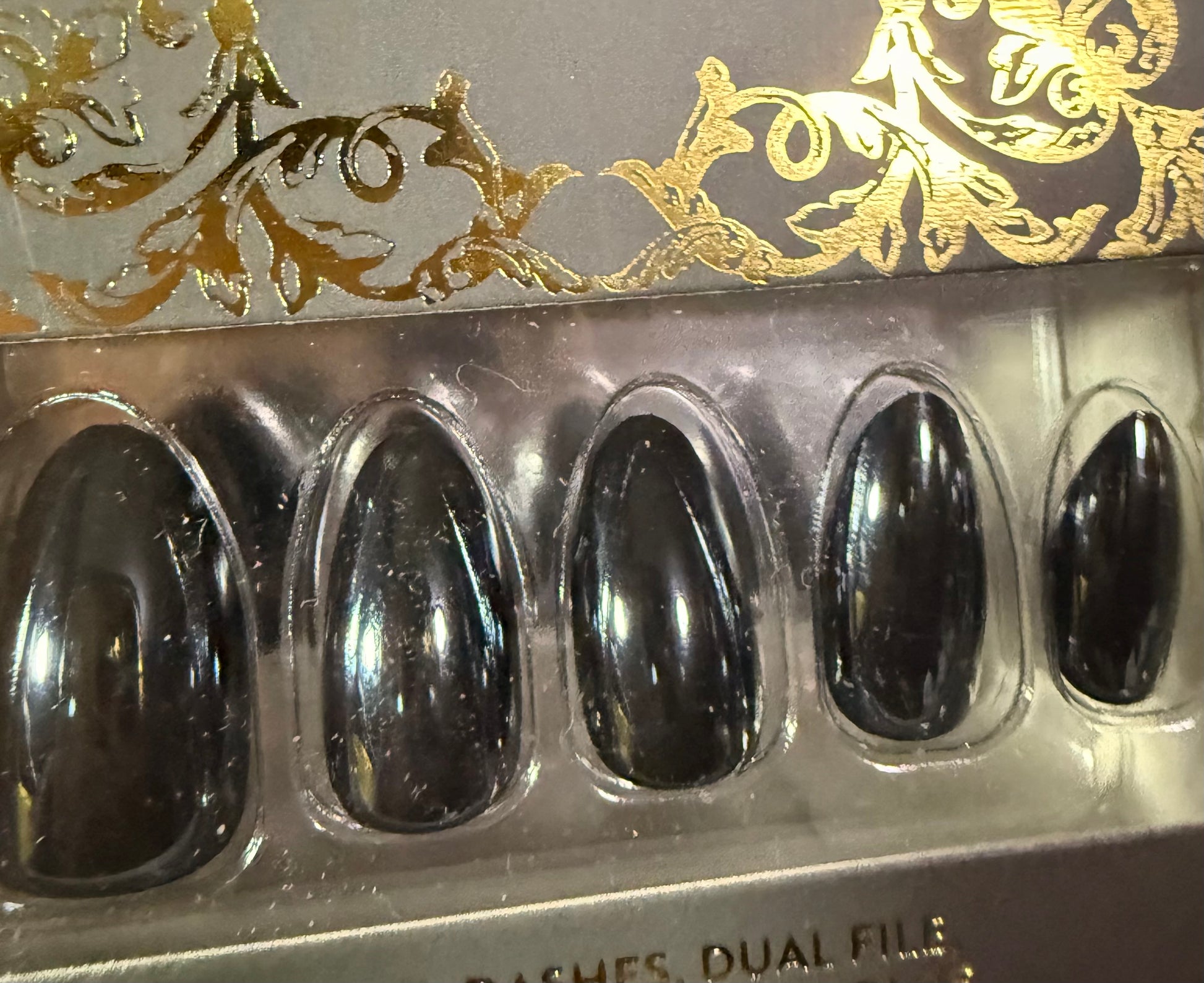 medium almond press on nails come in a black shiny finish with a glazed nail design